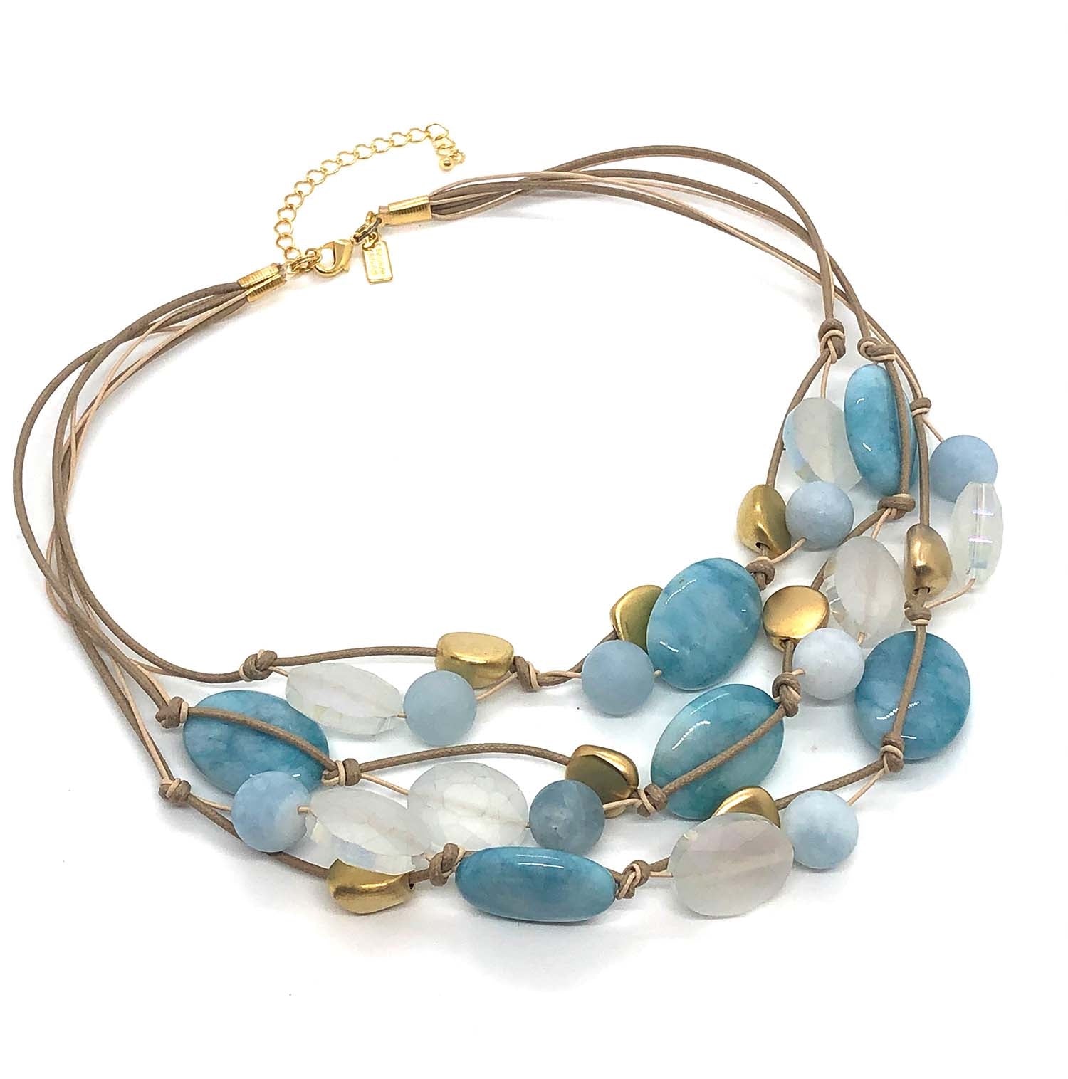 Matte Aquamarine And Blue Larimar Matte Gold Nugget Natural Linen And Putty Leather Toursade Necklace