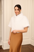 This short bolero, made from fox fur, is both enveloping and incredibly lightweight, making it a pleasure to wear. It features a round neckline and a hook-and-eye fastening. The unlined design enhances breathability, while the minimalist style showcases the knitted fur. Suitable for both day and night, this piece adds a unique and bold touch to any outfit.