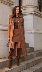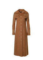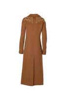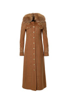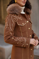 Long Embroidered Beaded Coat with Detachable Fox Collar in Dark/Light Camel
