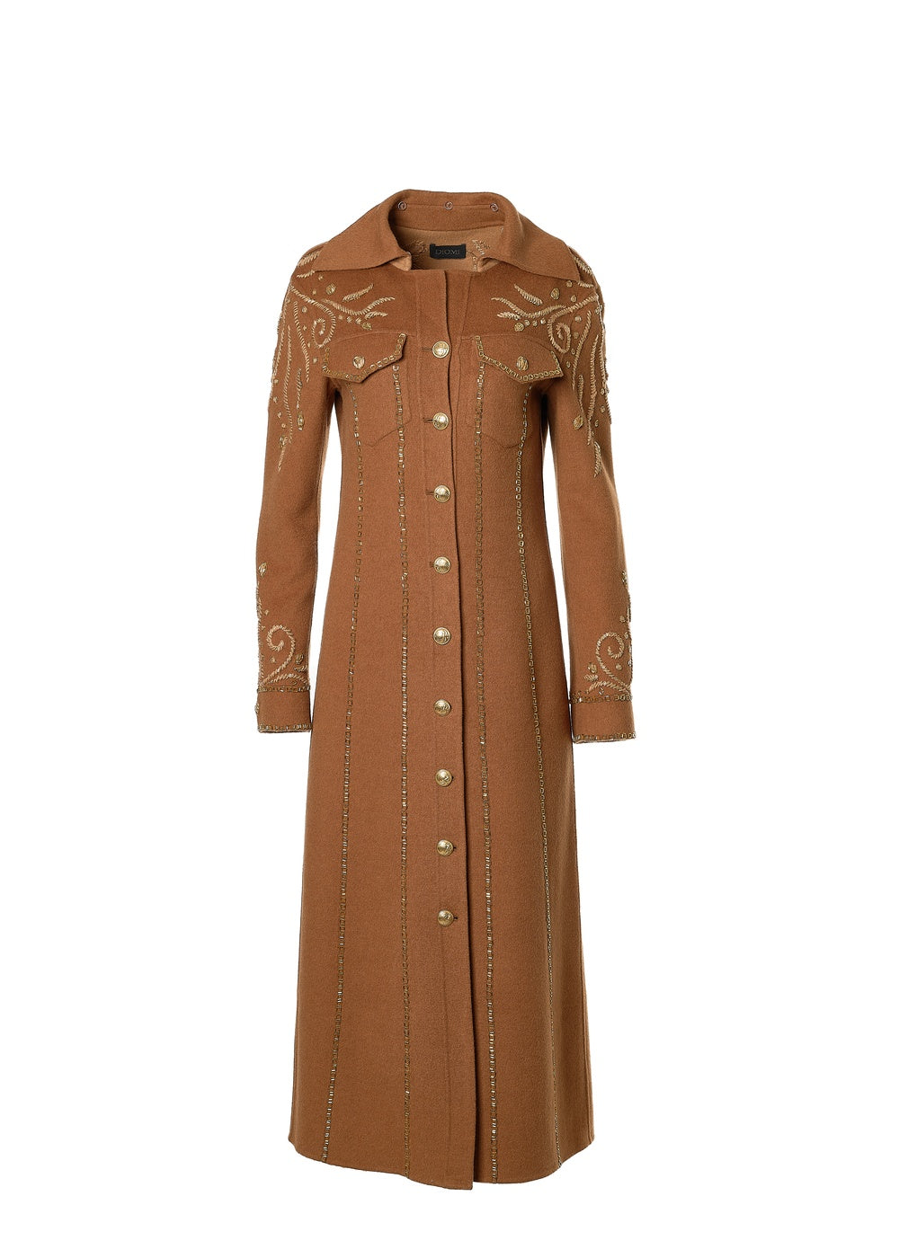 Our Long Coat with Hand Embroidery is a remarkable work of art. Crafted from luxurious wool cashmere fabric, it features exquisite handmade embroidery with elegant golden details and unique handmade ceramic buttons. This blazer is ideal for any occasion, and its sophisticated design is perfect for discerning lovers of luxury fashion.