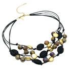 Matte Black Crystal, Brown Tigers Eye, And Matte Gold Beads On Black Leather And Linen Torsade Necklace
