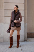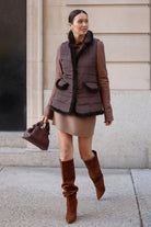 Crafted from water repellent nylon, this quilted vest features light padding in a slim-fit style, complete with a lapel collar and fur trimming along the lapel and front flap pocket for added sophistication.
