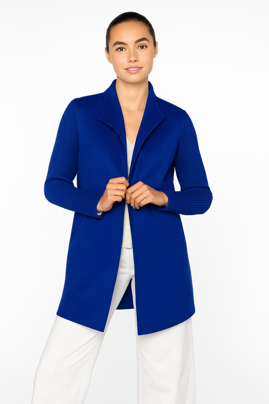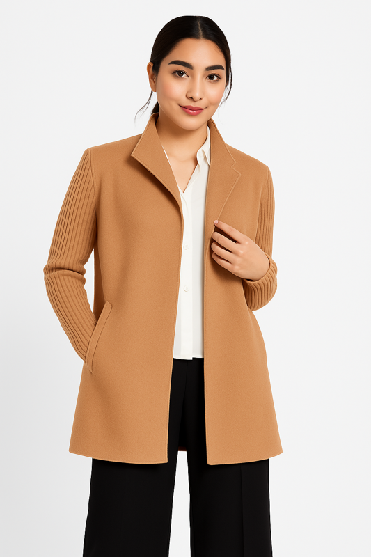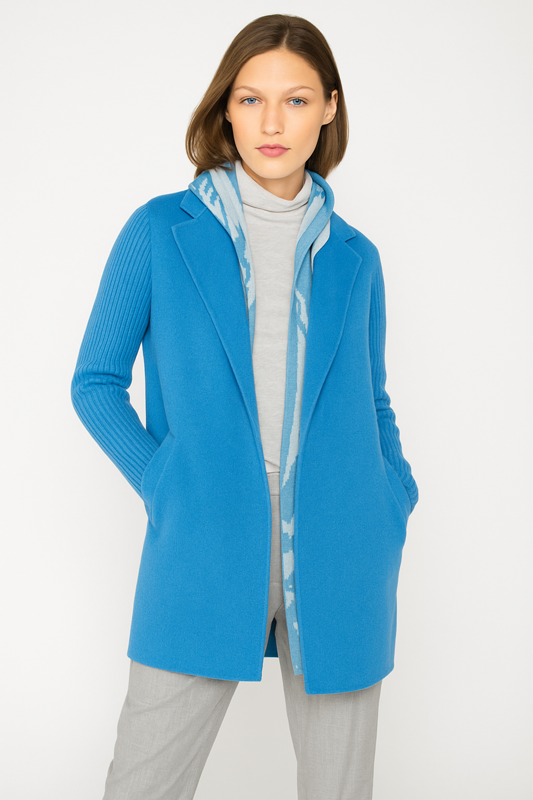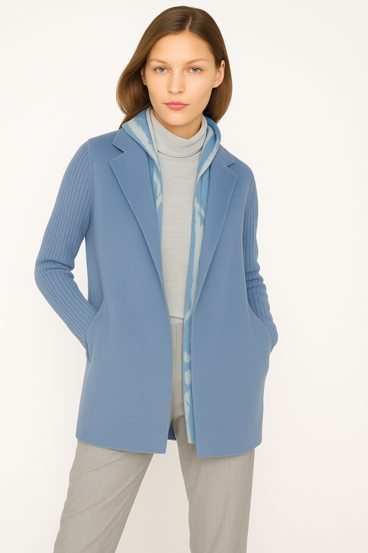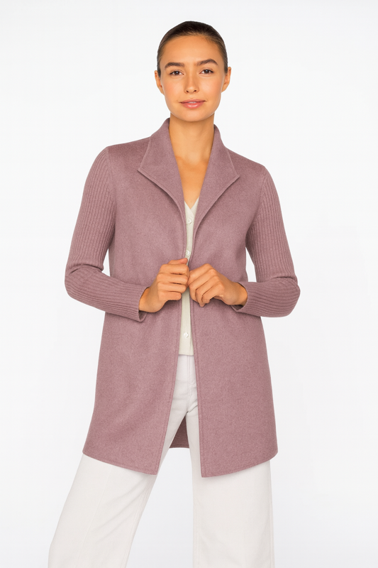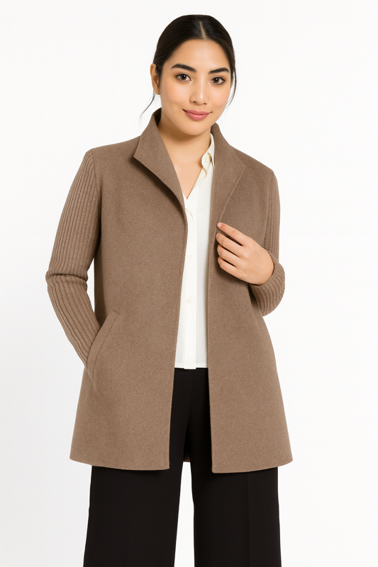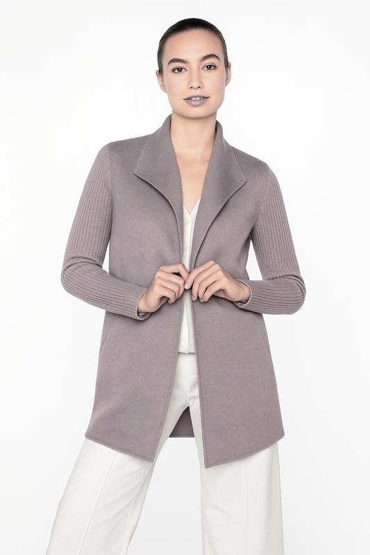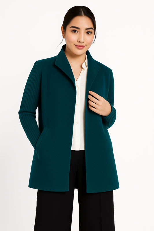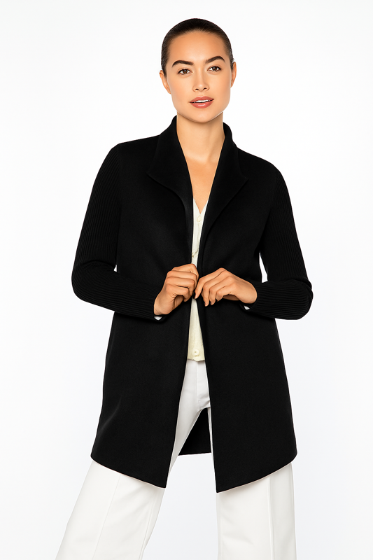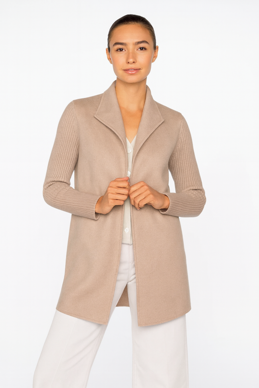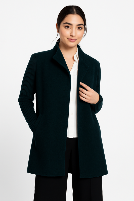 Ribbed sleeve detailing adds subtle texture and a contemporary edge to a refined outerwear silhouette. The rich wool-cashmere blend delivers the warmth and structure of wool with the exceptional softness and drape of cashmere, creating a lightweight yet insulating layer that moves with you.