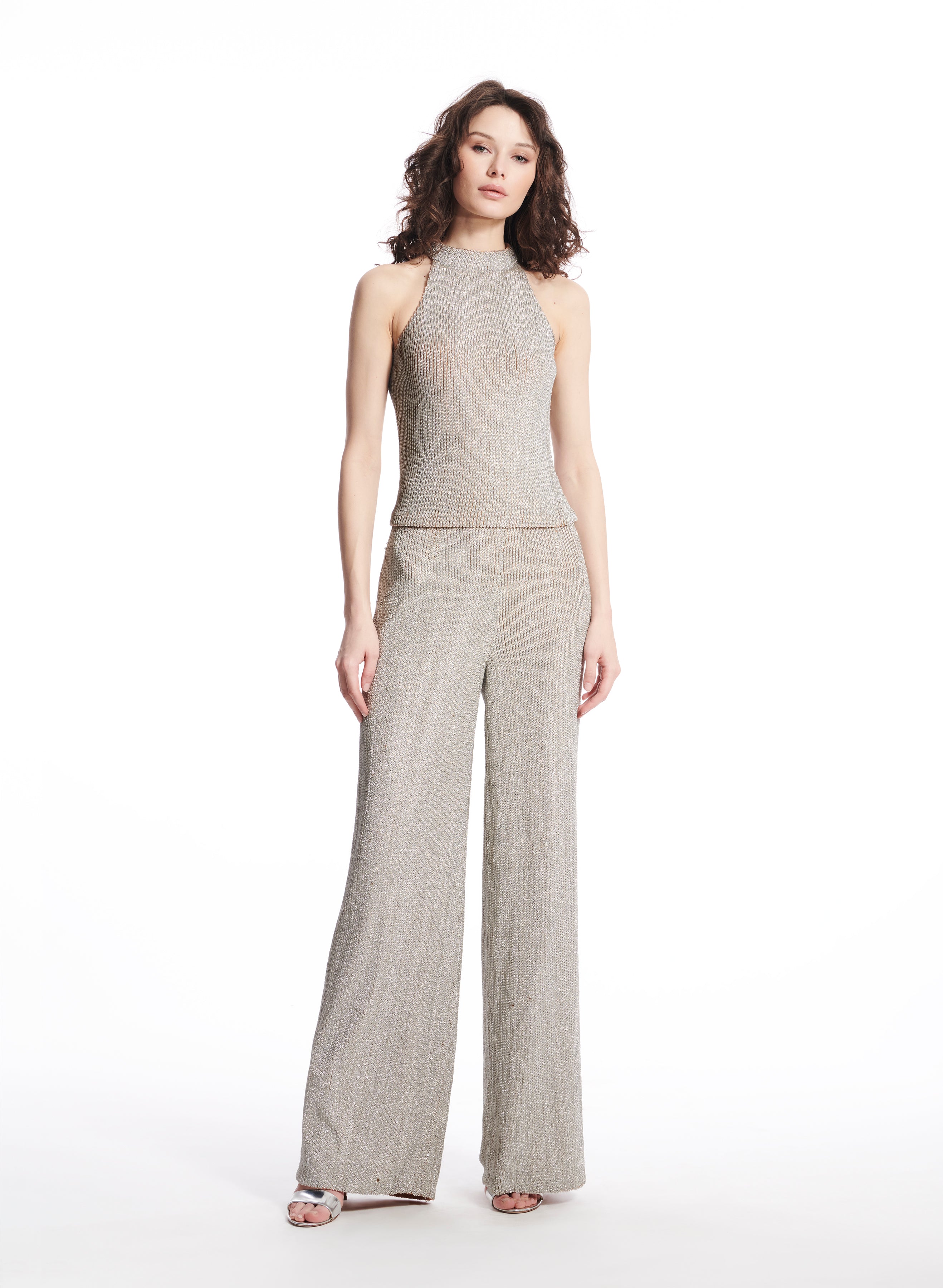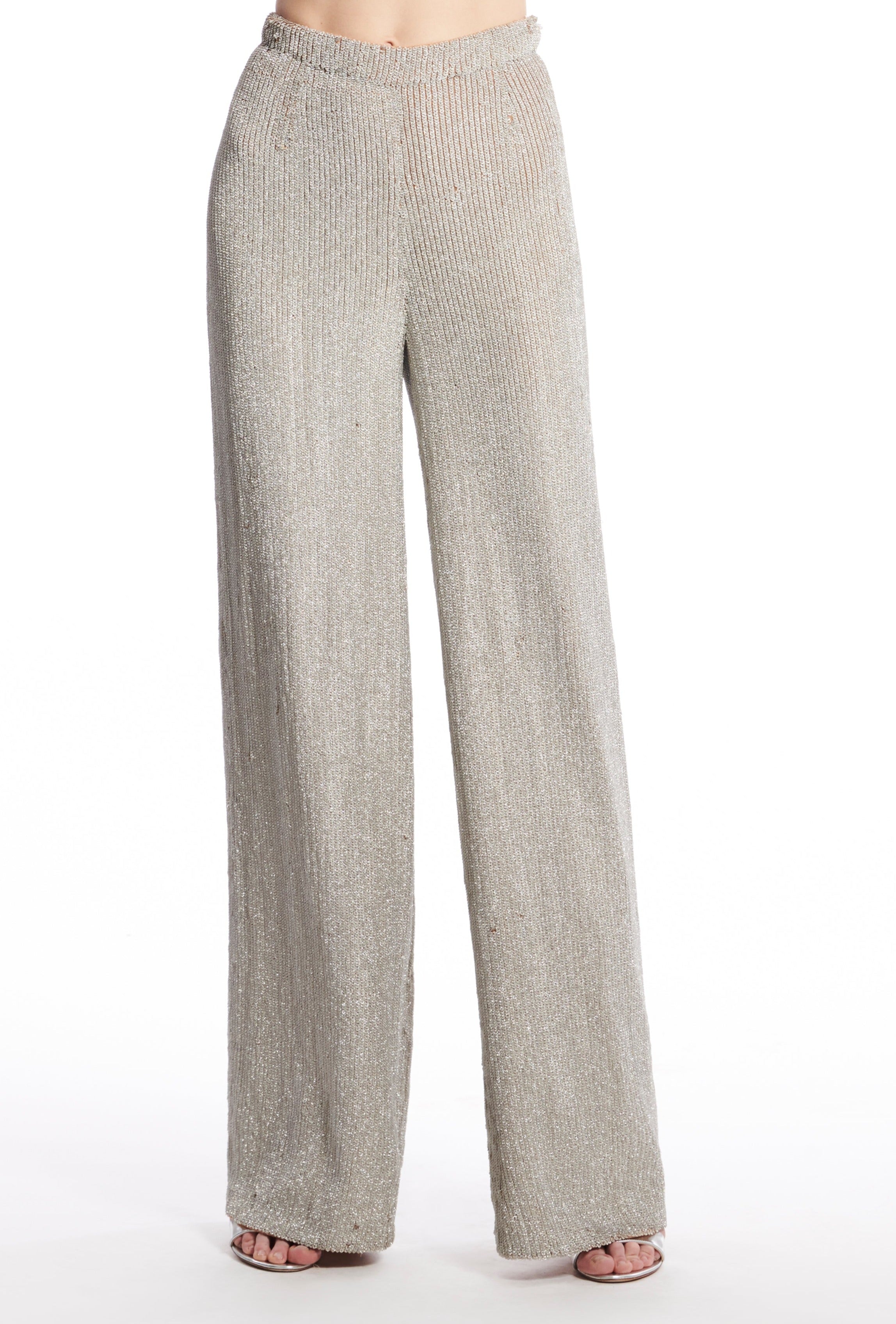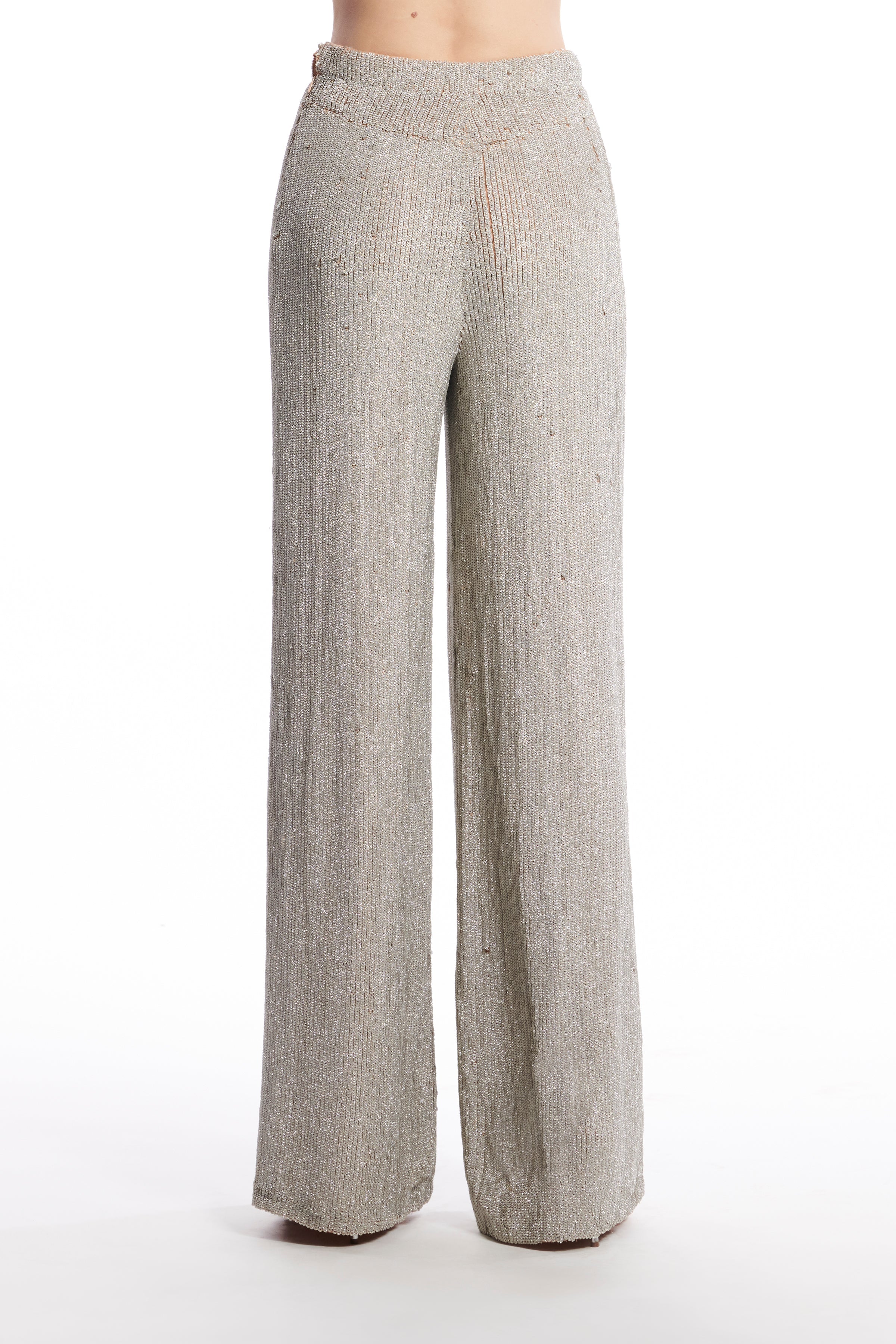 The sophisticated way these pants sparkle is a little hard to describe, but makes us think of crystals in a cave and shine in both silver and gold at the same time. It's hard to explain in words but you won't need to when you show up wearing it to the party! There is an understated elegance in the dark way it sparkles. Trouser leg elongates, 32" inseam. Wear with our matching mock neck top or slouch top or tee for the complete look. Absolutely stunning. Made in India.