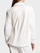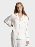 Limited-edition Sarah Alexandra x Salua Lingerie long sleeve pajama set in white with chocolate brown piping.