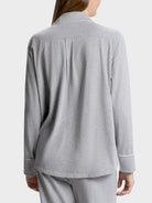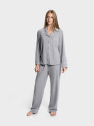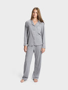 Limited-edition Sarah Alexandra x Salua Lingerie long sleeve pajama set in heather grey with white piping.