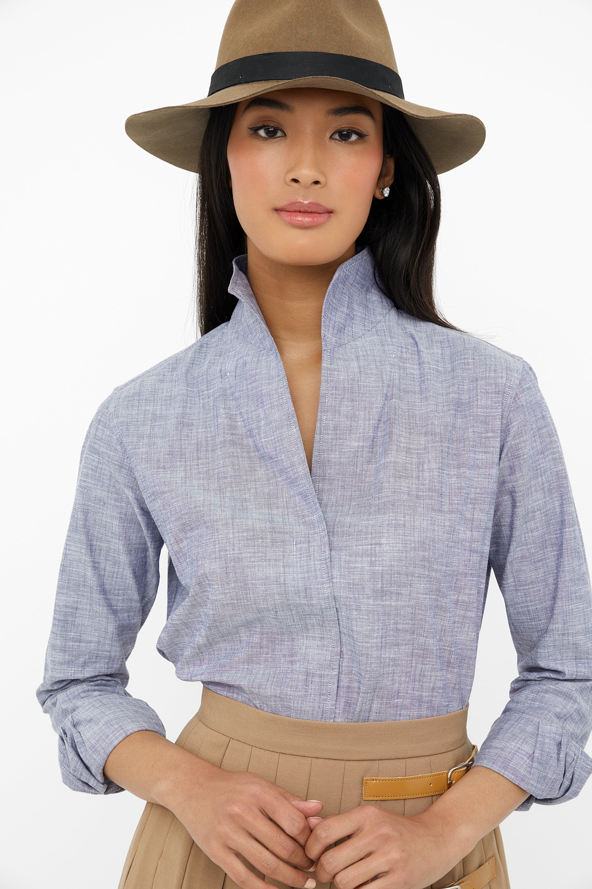 The Signature Shirt is fashioned with our innovative and fully shapeable one-piece collar for dramatic styling. Pop it high, create an alluring angle, or lay it flat—just follow your mood. The concealed front placket hides ingenious fish-eye buttons for a seamless appearance. Chamfer cuffs add extra elegance.