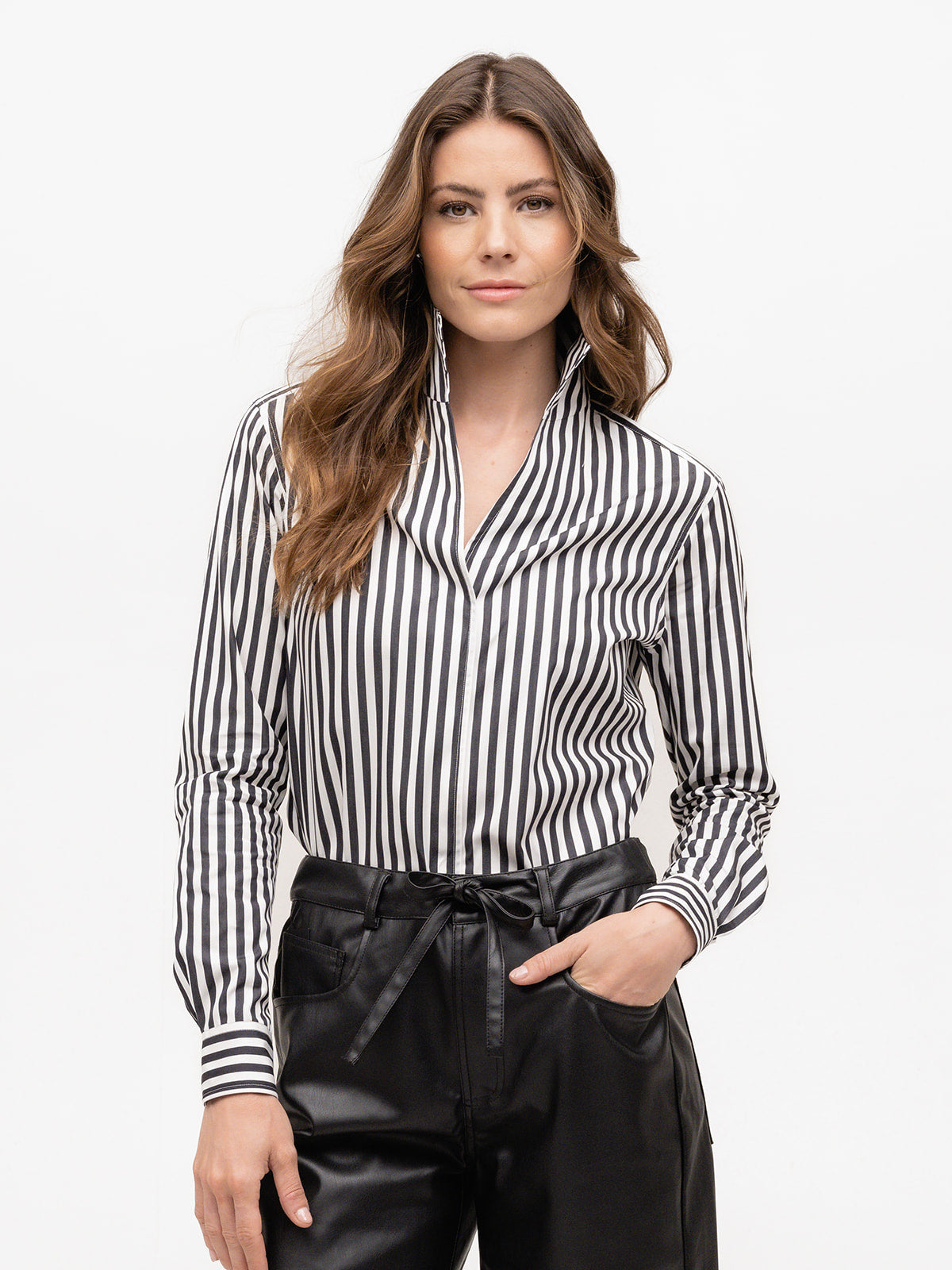The Signature Shirt is fashioned with our innovative and fully shapeable one-piece collar for dramatic styling. Pop it high, create an alluring angle, or lay it flat—just follow your mood. The concealed front placket hides ingenious fish-eye buttons for a seamless appearance. Chamfer cuffs add extra elegance.