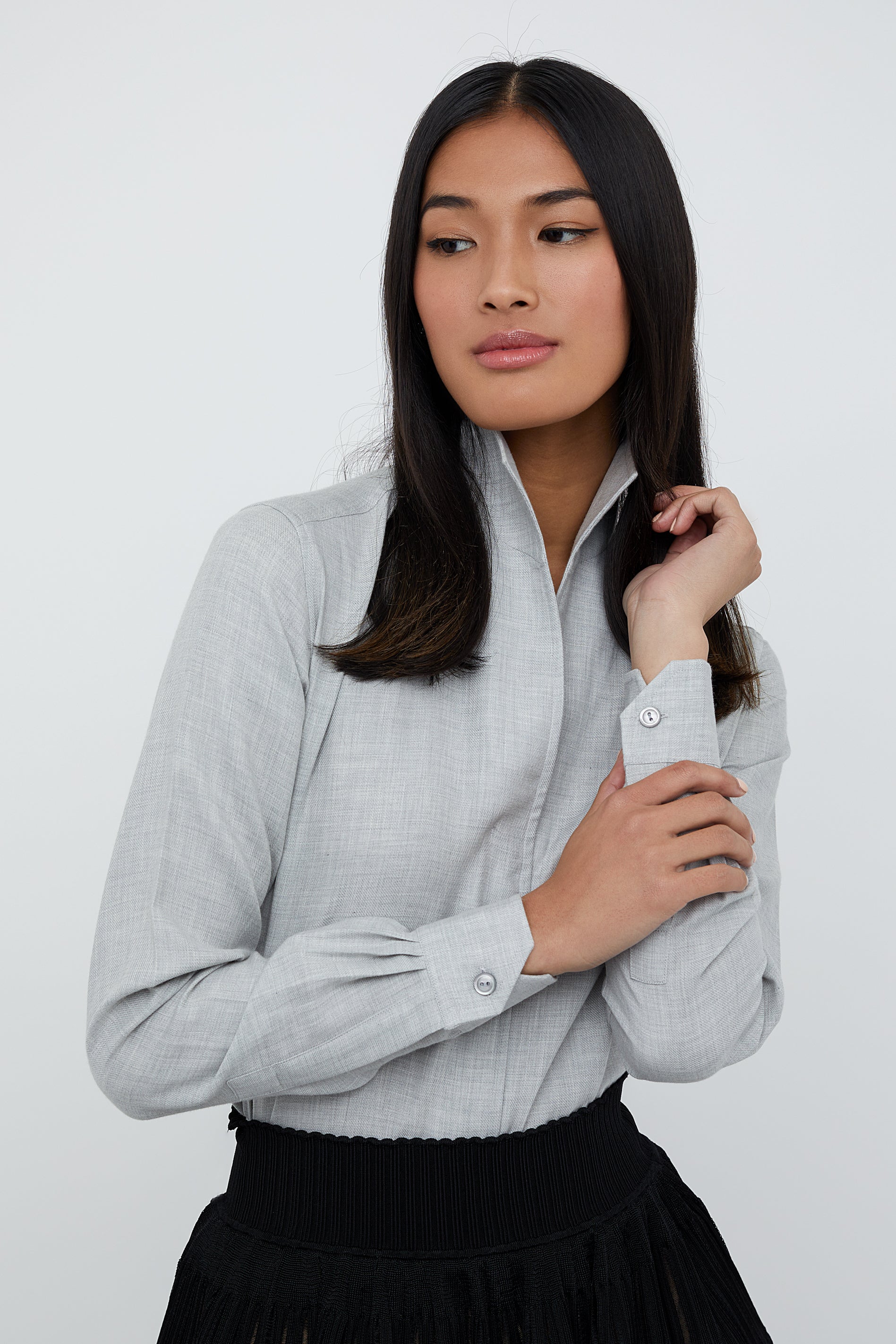 The Signature Shirt is fashioned with our innovative and fully shapeable one-piece collar for dramatic styling. Pop it high, create an alluring angle, or lay it flat—just follow your mood. The concealed front placket hides ingenious fish-eye buttons for a seamless appearance. Chamfer cuffs add extra elegance.