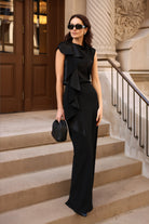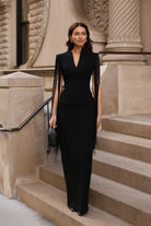 Our column skirt features a refined pencil silhouette, made from luxurious bonded triacetate in a sophisticated military black. The sleek design is enhanced by a back slit and a form-fitting cut that cinches the waist for a tailored look.
