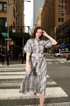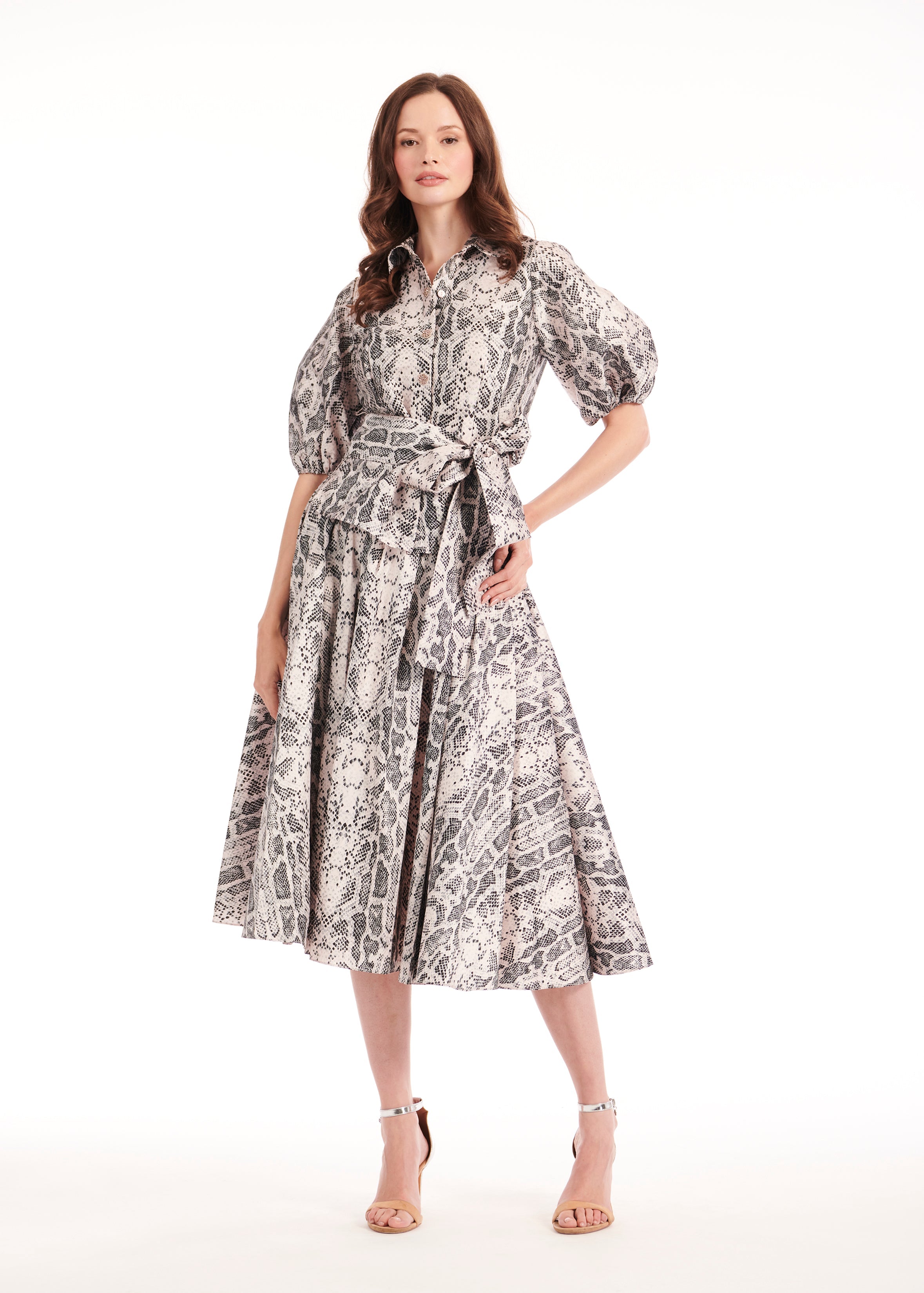 Snake print in black and blush on our best selling 34” taffeta Midi length skirt (with pockets!). Go snake crazy with the matching puff sleeve blouse. Or your favorite white tee for a more casual rendition. The designer will be wearing this one with a cashmere black tee…….. often.
