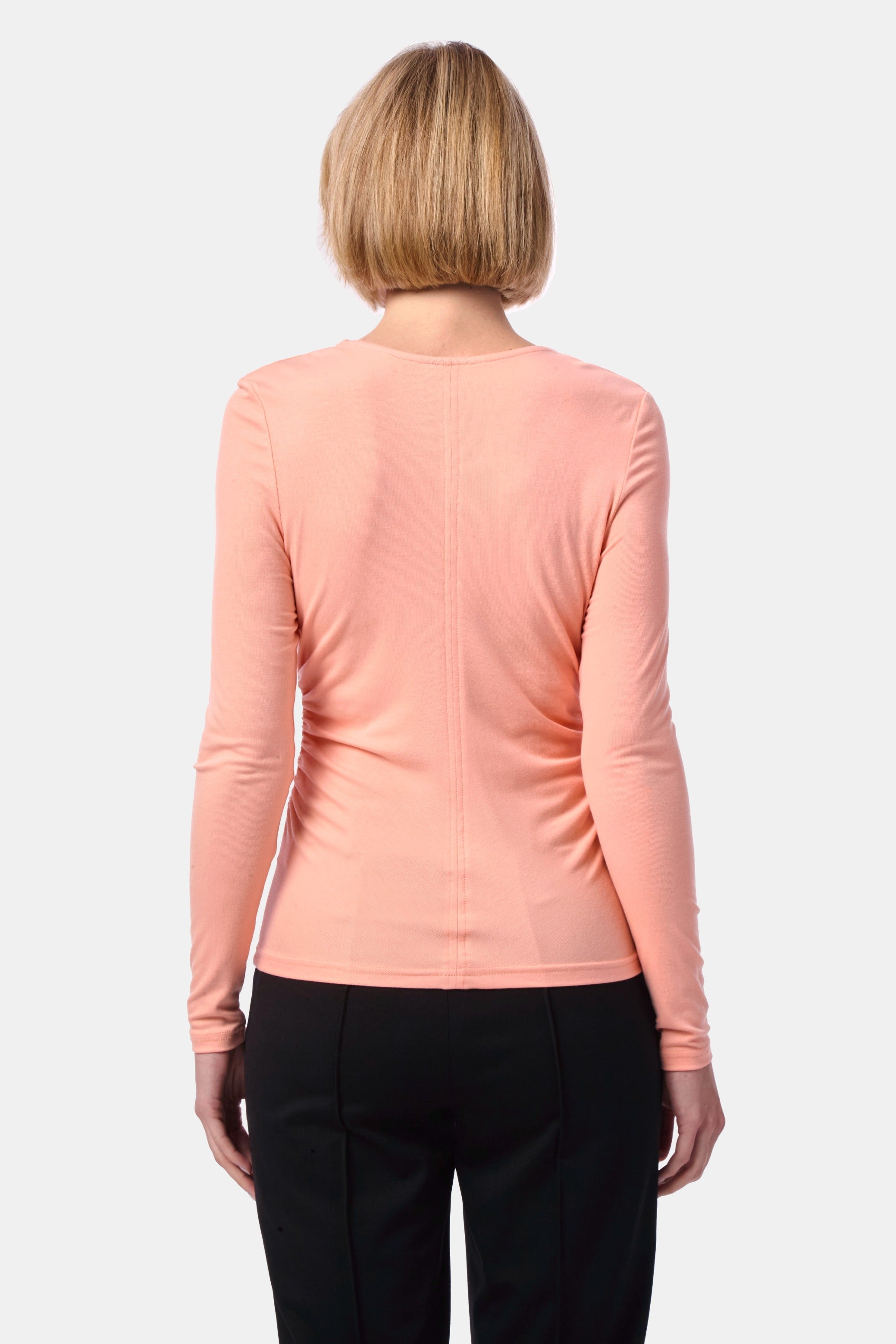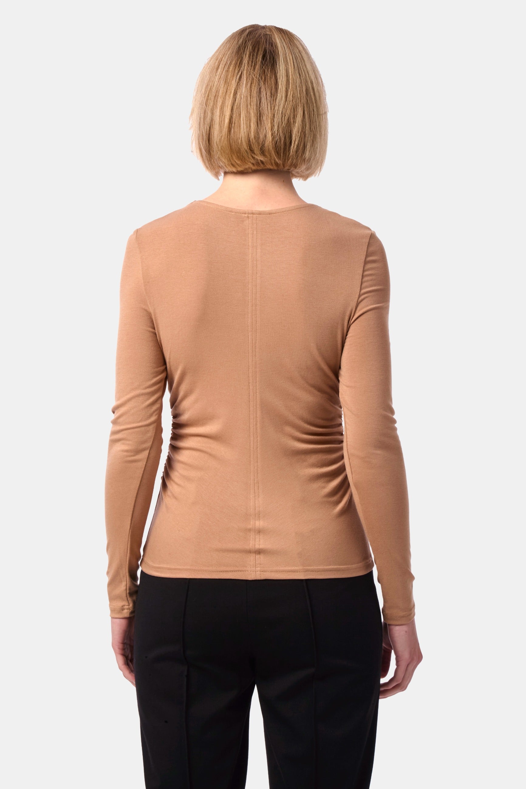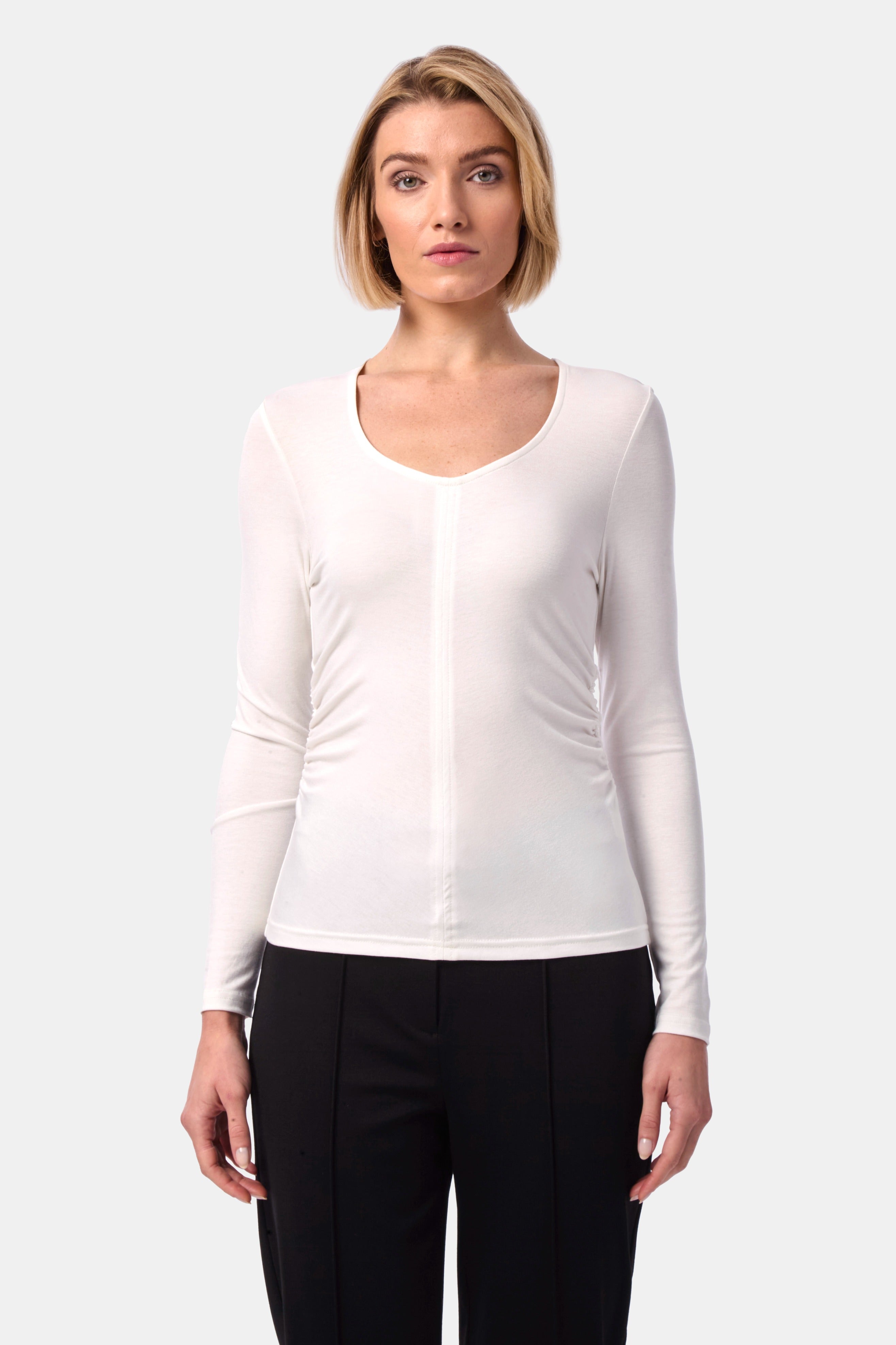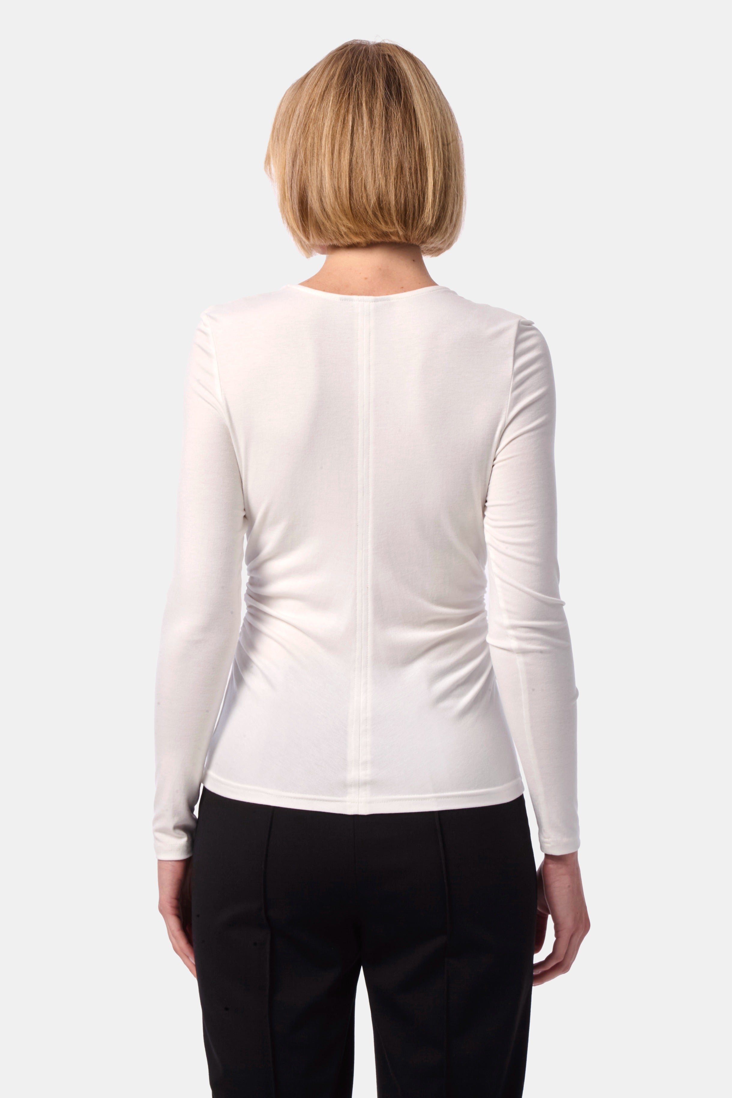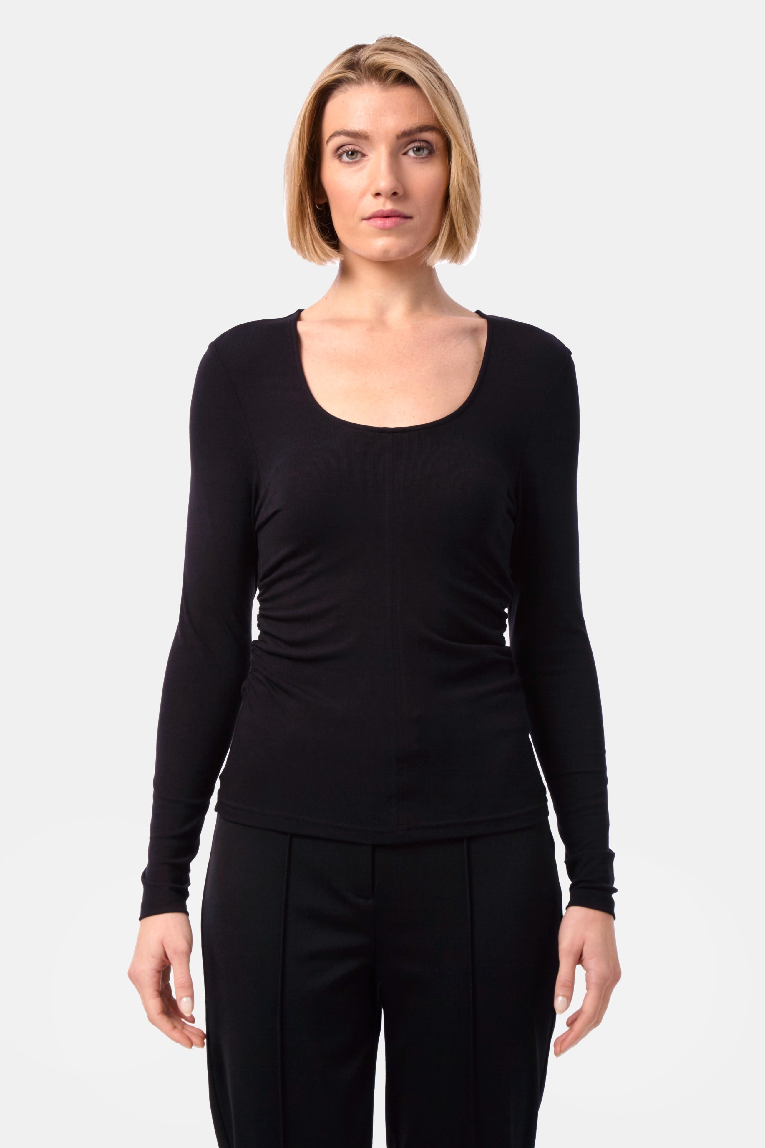 Feminine all the way. This perfectly rounded neck tee has rouching on the side for the most flattering fit.