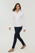 Meet the perfect elevated take on the classic button-up white shirt – the Alida Button Down Poplin Shirt. This stylish women's button-up shirt features a crisp white color with a modern slim fit silhouette and flattering designer seaming. A timeless button front-closure and bold menswear-inspired collar add a sophisticated feel to this must-have piece. Crafted using Anatomie's signature wrinkle-resistant fabrics, this essential women's top is perfect for slipping on with any look, from casual and cool to polished and professional.