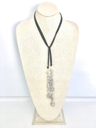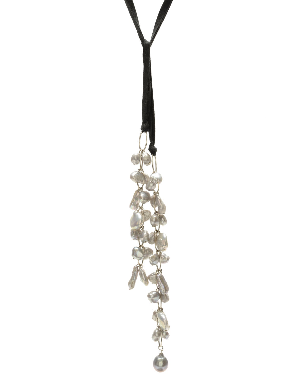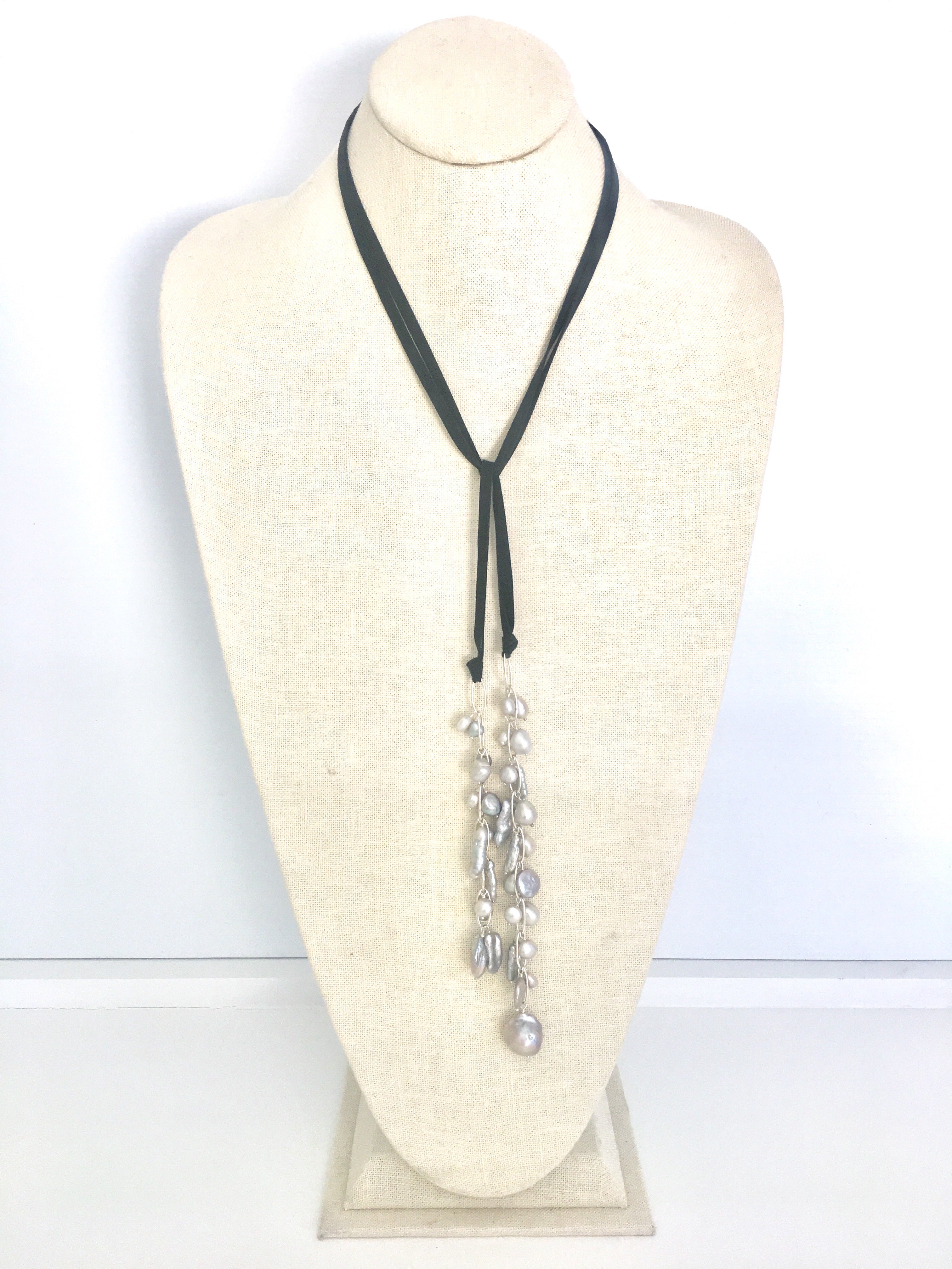 Grey pearls on white brass chain with black Japanese ultra suede cord