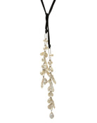 Fun and very unique lariat. Wonderful assortment of pearls in different sizes attached by soft Japanese ultra suede cord.