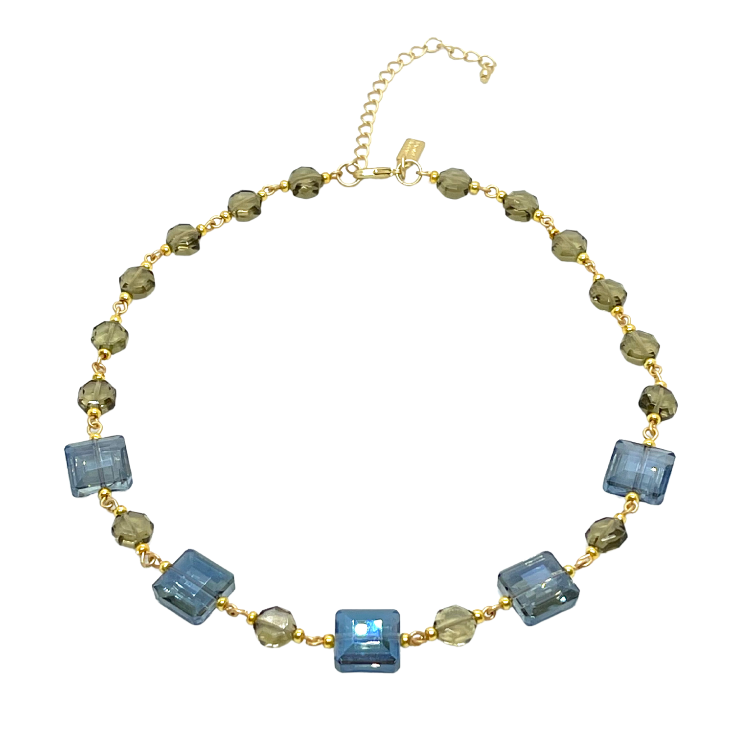 Blue Square Crystal and Smoke Topaz Link Necklace