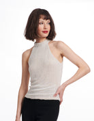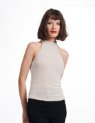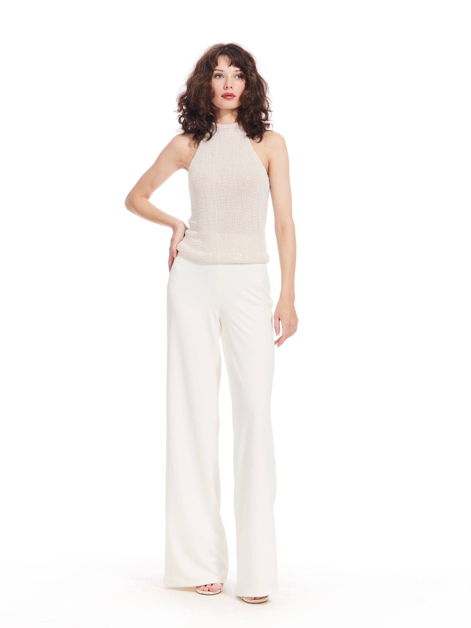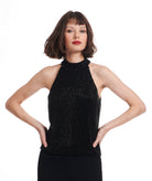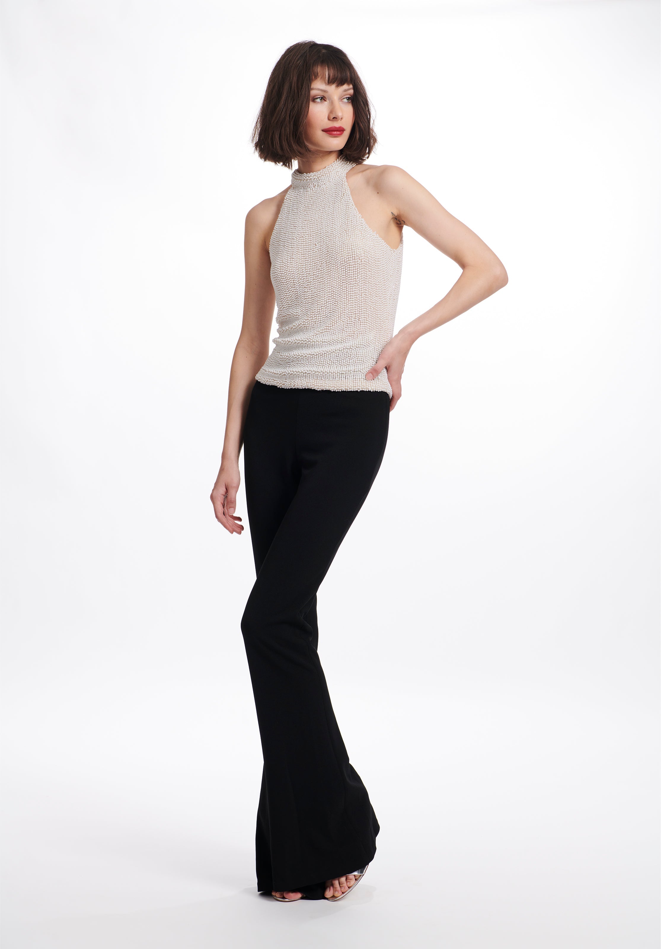 Dramatic mock neck halter tank fully encrusted, top to bottom in tiny pearls. Our number one special event top is truly elegant. Wear with our taffeta or stretch satin skirts, our fabulous stretch crepe pant or your favorite jeans. Made in India. XS-XL.