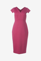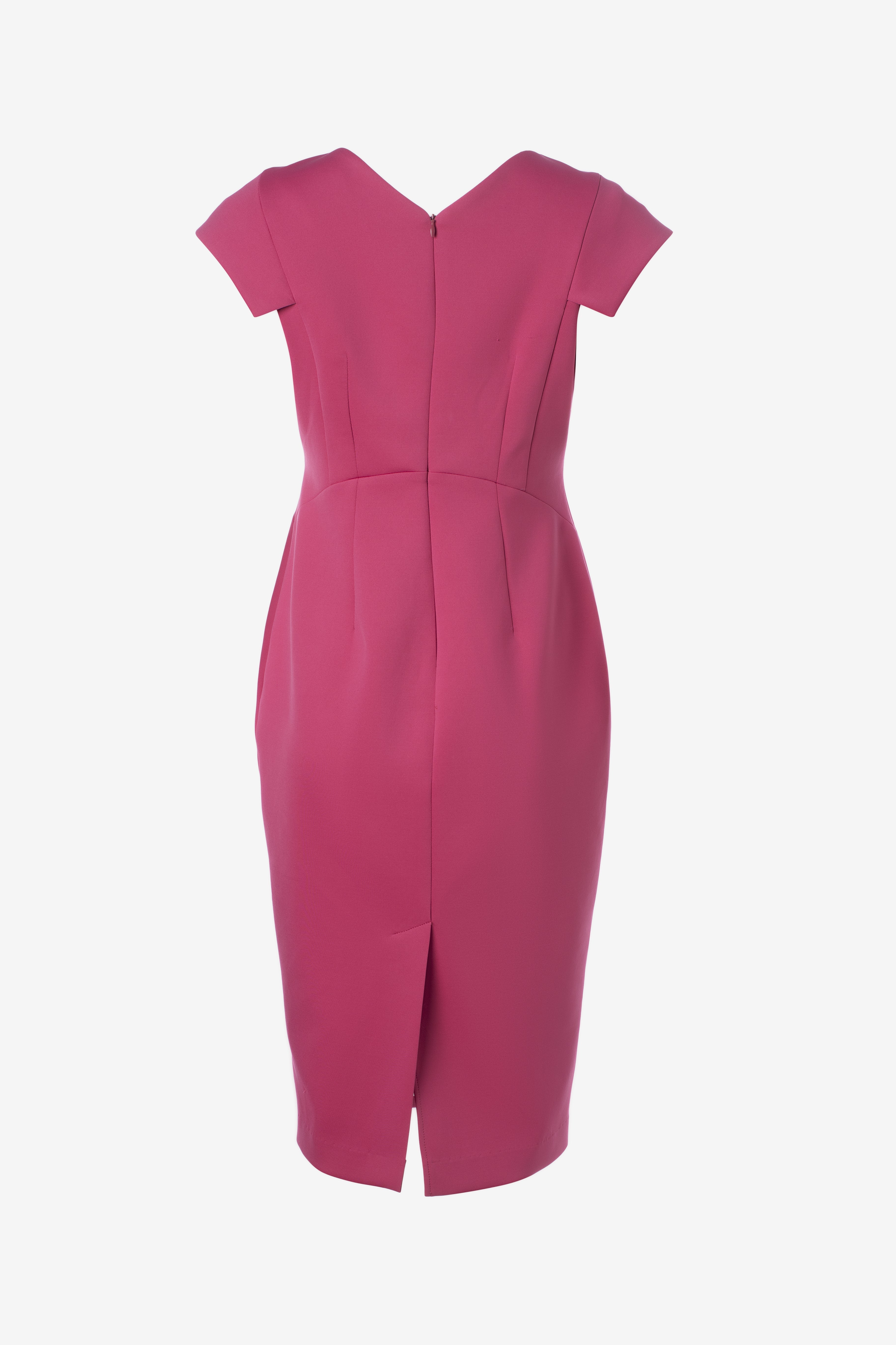 Sleeveless, fitted dress with V-neckline at chest and back, offers a very flattering figure, the ruffles on the shoulders accentuate the desired hourglass waist effect.