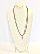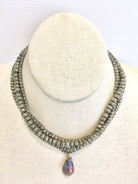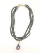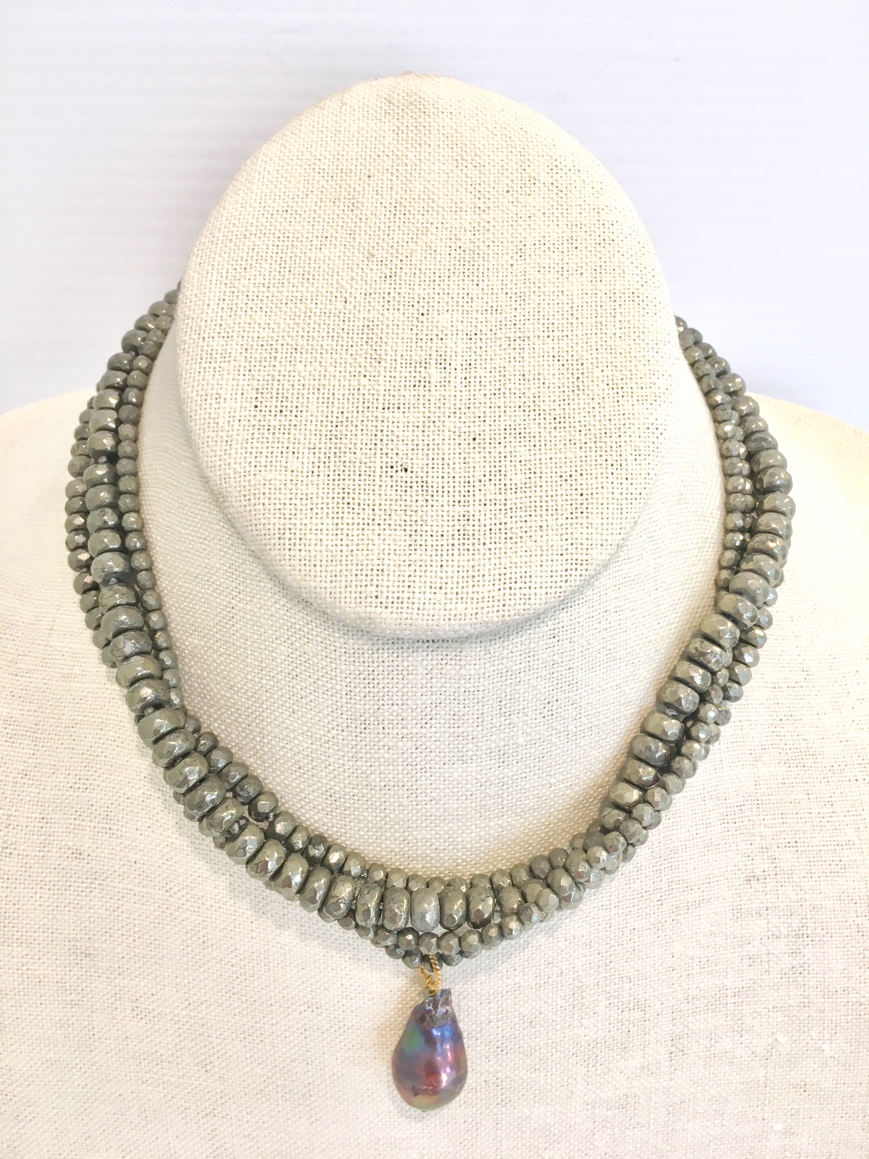 Chunky 4 layer necklace with pyrite and a baroque pearl. Can be worn short or long.