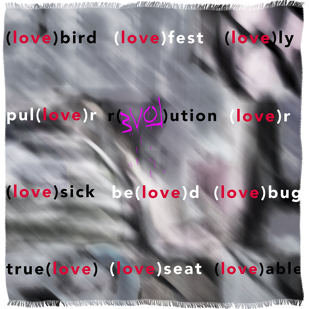 The rendering of the meaning and word "love" found within other words. Size: 145 cm x 145 cm