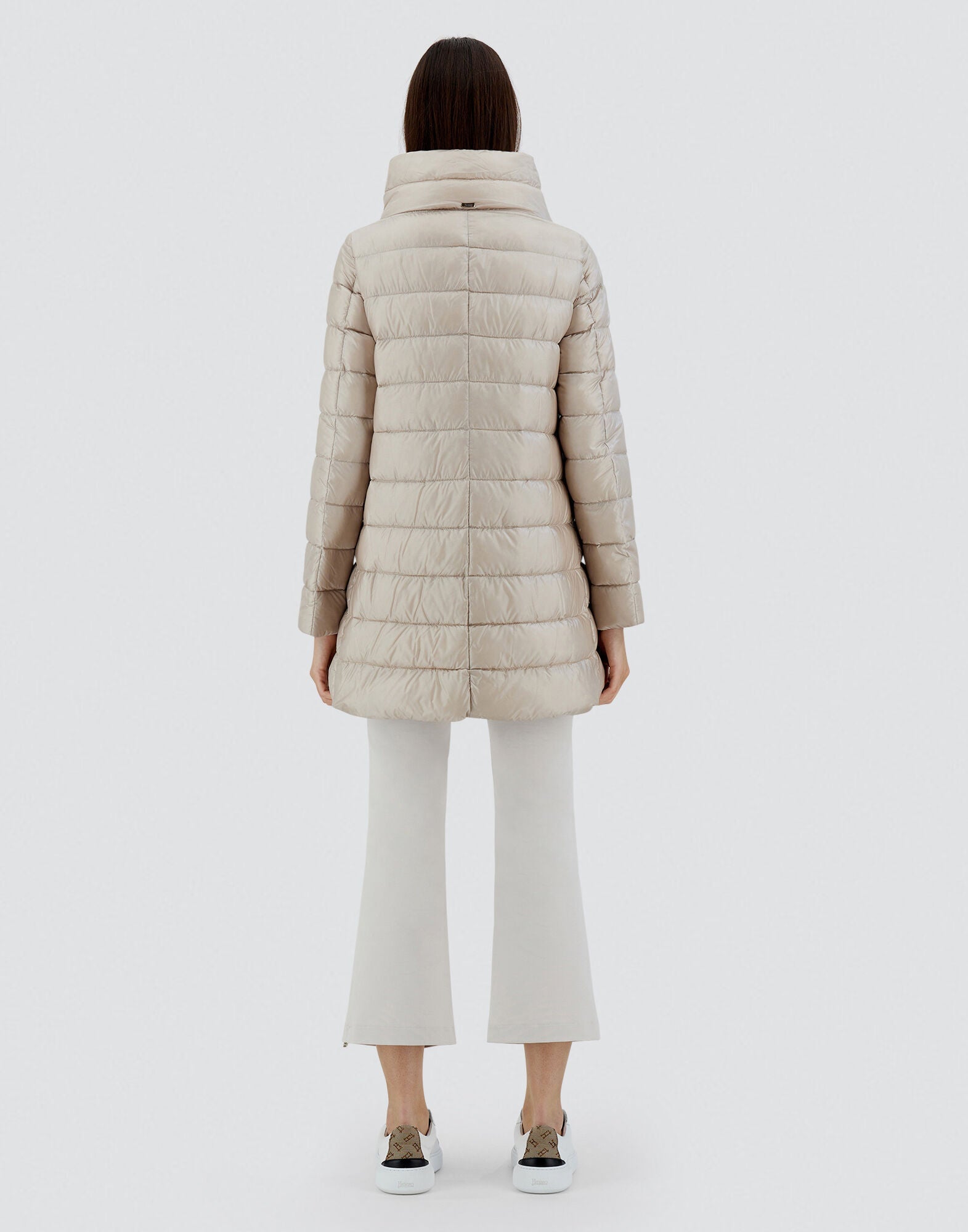 This Amelia A-Line Classic Hi-Lo jacket combines timeless A-shape design with advanced materials for exceptional performance. Crafted from ultralight 20-denier Japanese nylon and filled with a refined 90/10 injected down, it offers remarkable lightness while maintaining warmth. Its water-resistant finish and smooth, silk-like texture deliver both practicality and a luxurious feel, exemplifying Herno’s commitment to innovative craftsmanship and understated elegance.