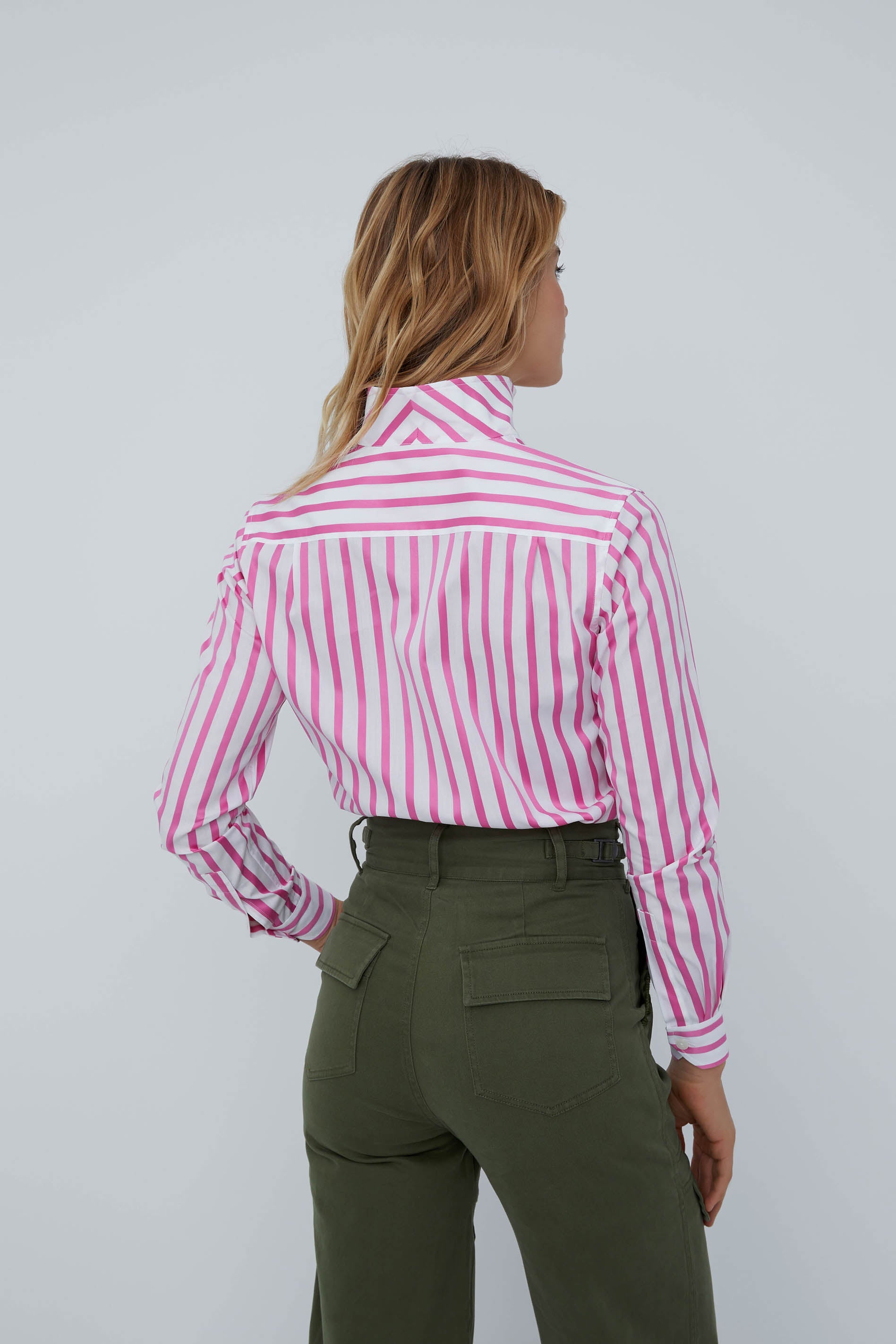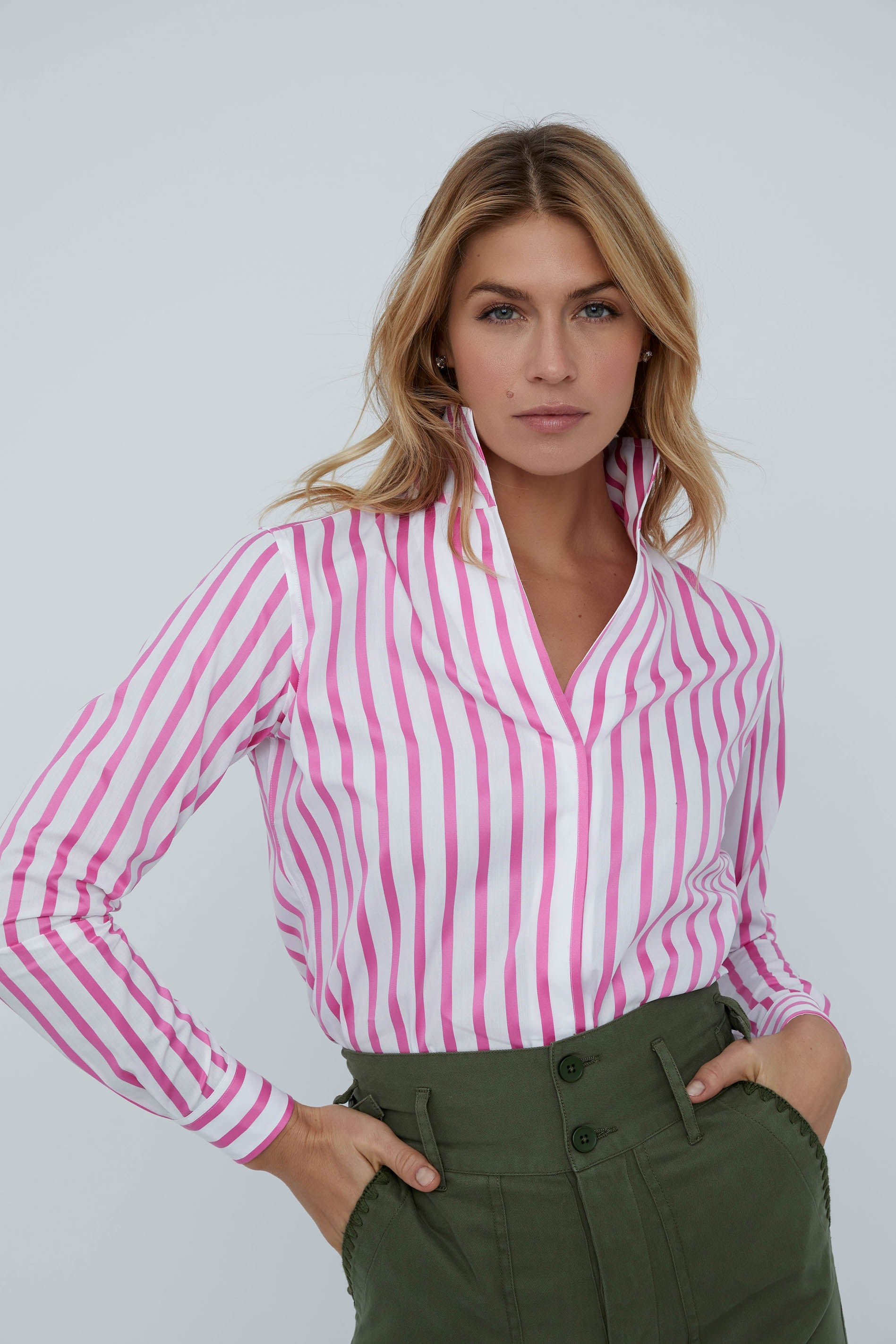 The Signature Shirt is fashioned with our innovative and fully shapeable one-piece collar for dramatic styling. Pop it high, create an alluring angle, or lay it flat—just follow your mood. The concealed front placket hides ingenious fish-eye buttons for a seamless appearance. Chamfer cuffs add extra elegance.
