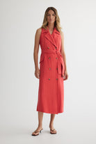 This elaborate sleeveless trench dress will give the wearer a classy look thanks to the two columns of buttons, the folded collar and the adjustable waist belt.