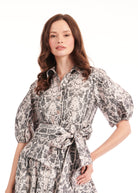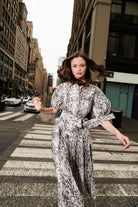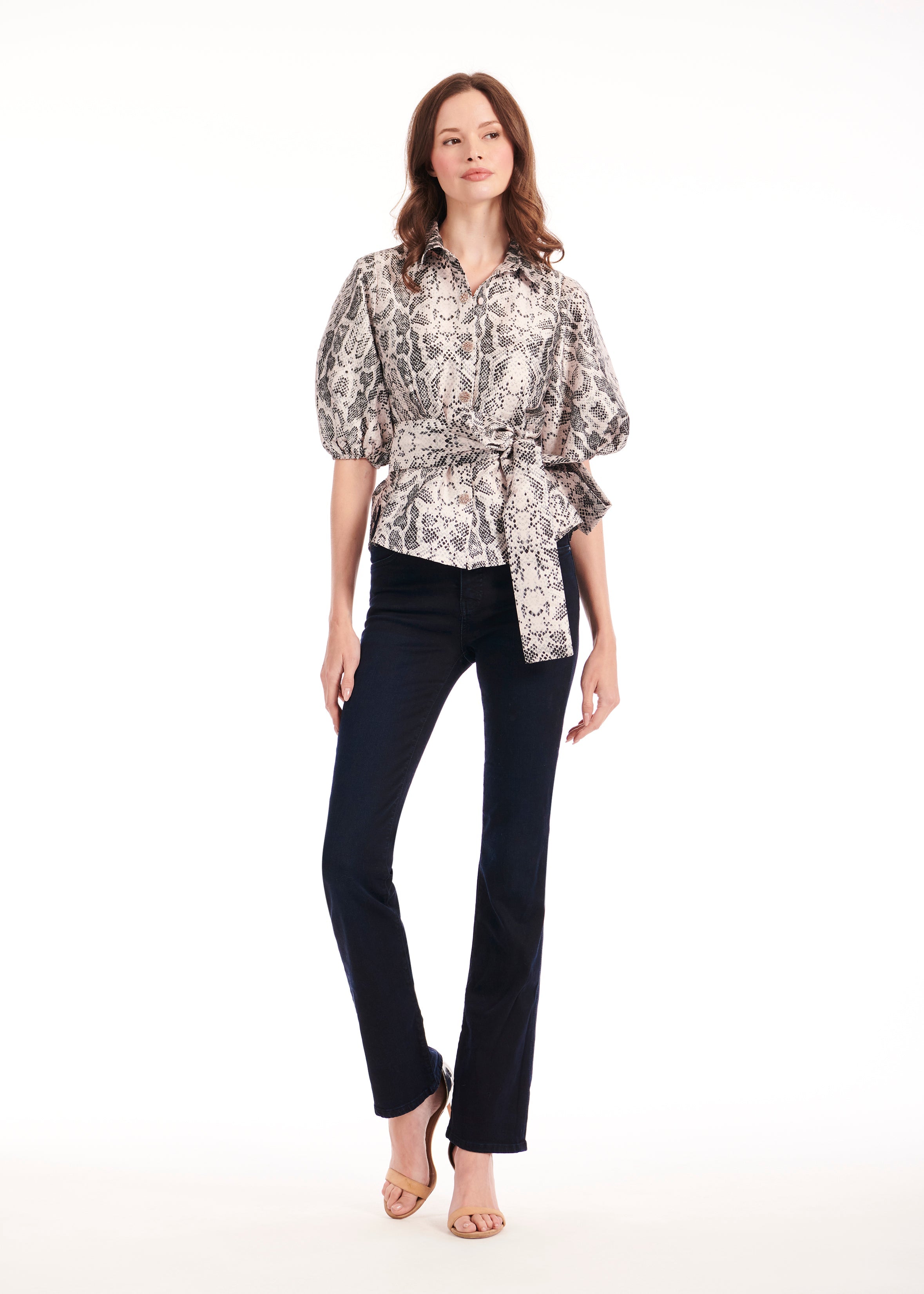 Our best selling taffeta puff sleeve blouse in the fabulous black and blush snake print. Jeweled flower buttons and soft tie sash. Wear with the matching snake midi tea length skirt for a snake version of fabulousness or your favorite pair of jeans already in your closet. Also a perfect match to our blush or black taffeta skirts.