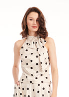 Stretch satin dot tie neck blouse is as comfortable as it is chic. Wear with our A-line stretch satin dot skirt or your favorite pair of jeans already in your closet. Easy peasy.