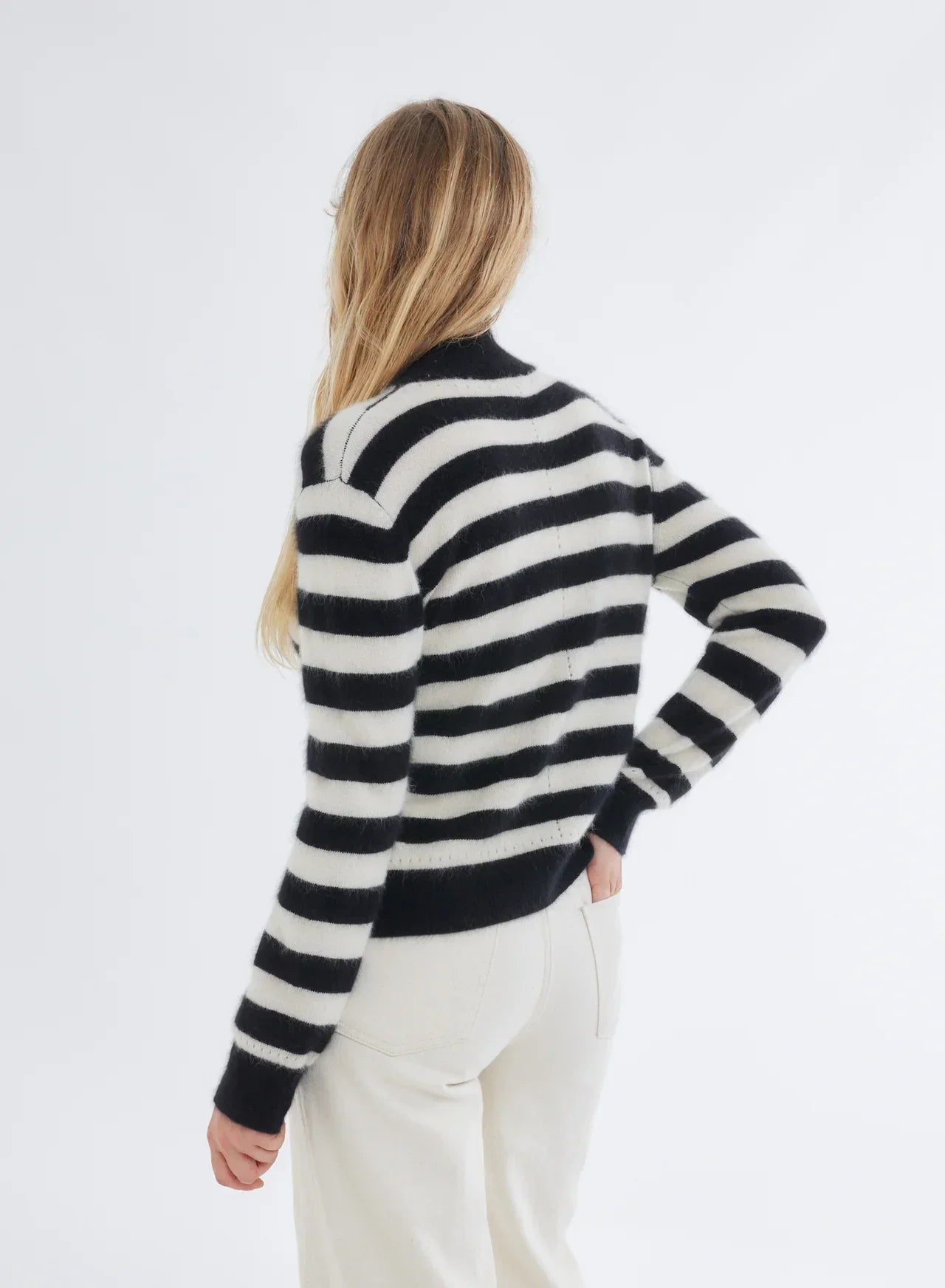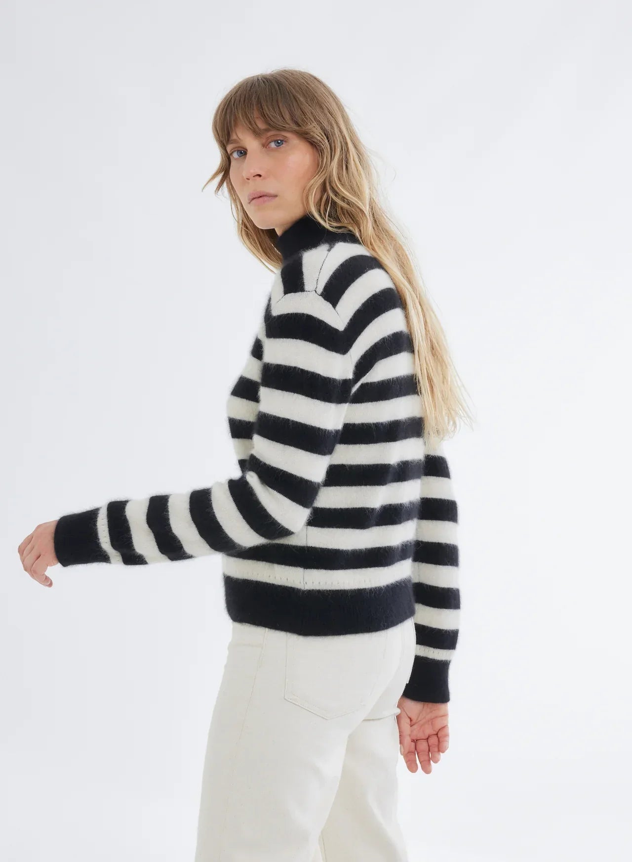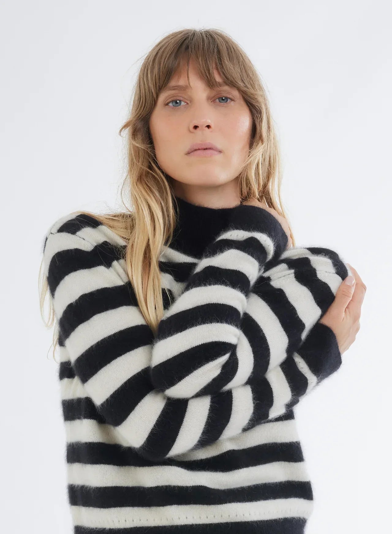 This ultra soft novelty stripe mock neck pullover sweater is designed with a relaxed fit and contrast collar and cuff. Laser cut details create an elegant edge to a timeless silhouette.