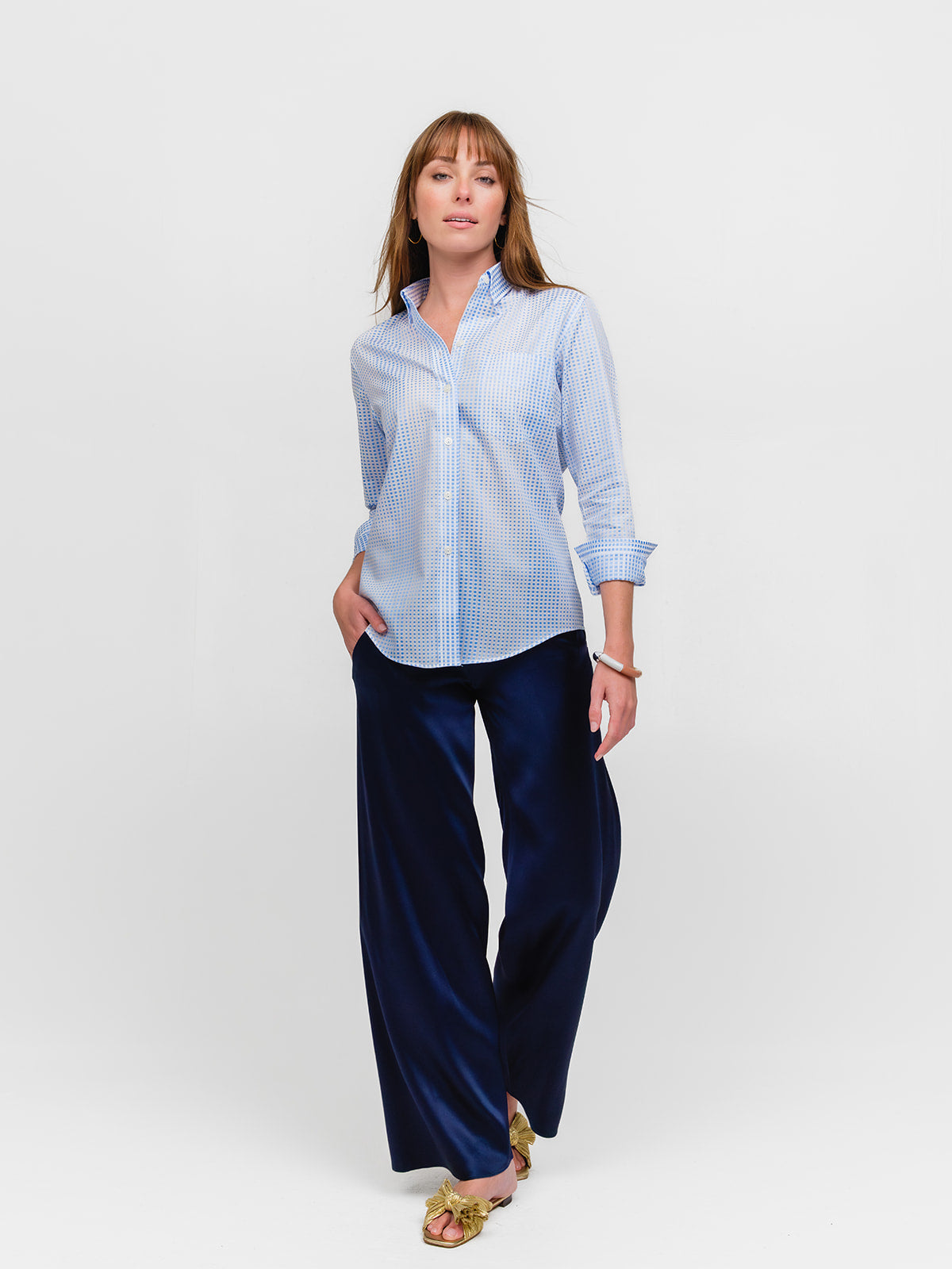 Positano? Ravello? Capri? Yes, please! Sarah’s sexy and fierce luxurious European cotton gradient polka dot delivers the blissfulness of Amalfi no matter where you wear it. Timeless and gorgeous as an Italian seaside resort. Glam it up with a pleated skirt, or go next level chic with white linen trousers or denim—meet you at Le Sirenuse for an Aperol Spritz? (Or two!)