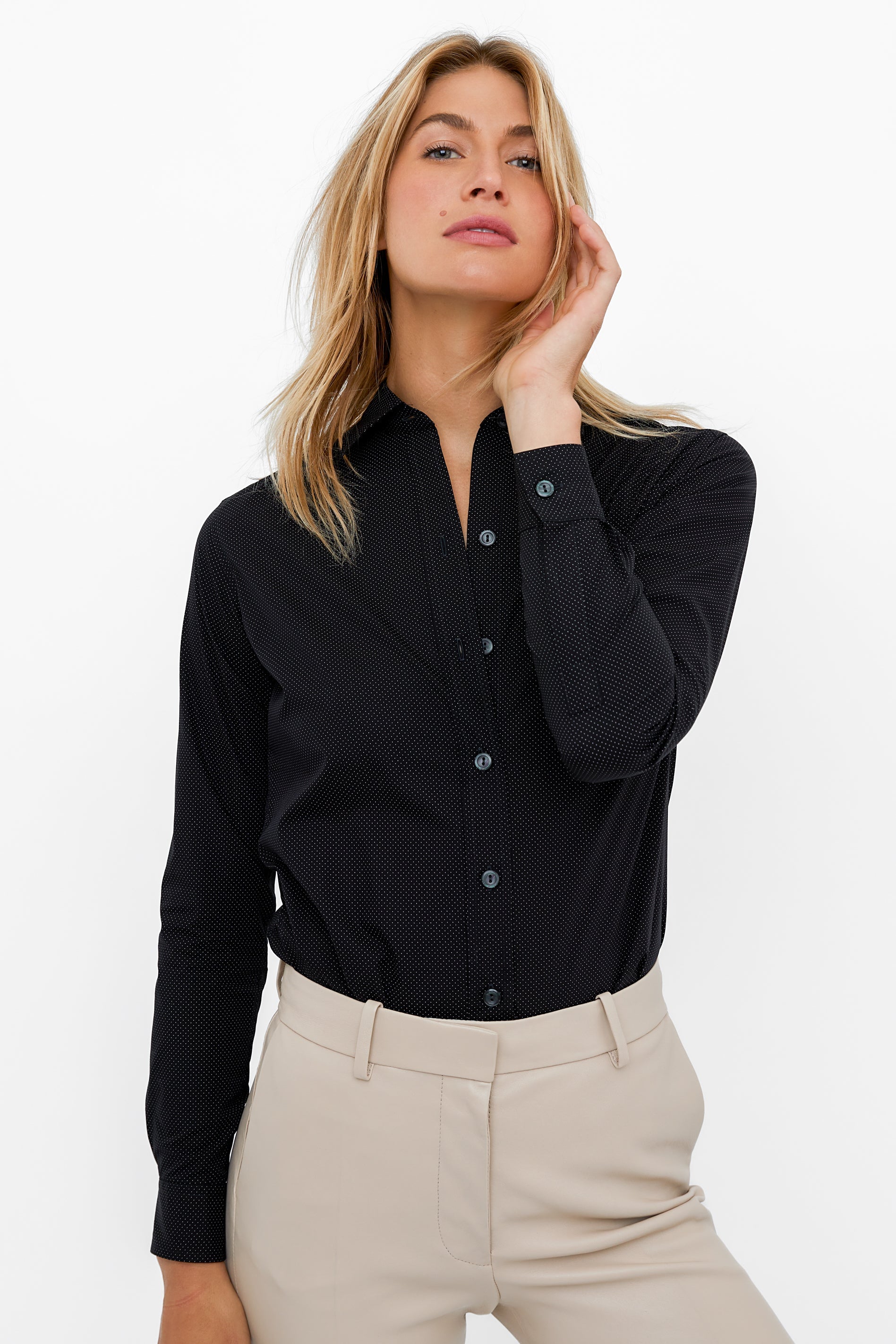 Thrill seekers wanted. Reach the peak of style in Sarah's fearless pin-dot. Her black and white number is anything but basic, and expertly coordinates with all your favorite pieces. Fiercely sexy yet quietly powerful, her refined Italian broadcloth slays—whether you blaze trails for business, pleasure or both. Button up and enjoy the ride.