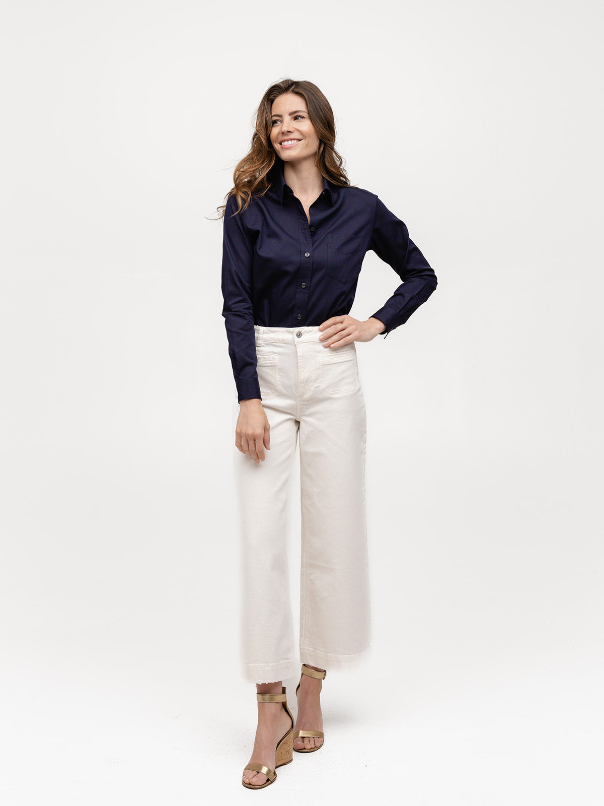 The Weekend Shirt embodies the carefree spirit of Saturdays and Sundays that you will enjoy and wear 7 days a week. Dress it up or down with your favorite jeans, edgy leather pants or a chic pencil skirt—it’s your go-anywhere, do-anything shirt. Sartorially influenced by menswear, this classic sports a two-piece collar, front pocket, and beveled placket and cuff buttons.