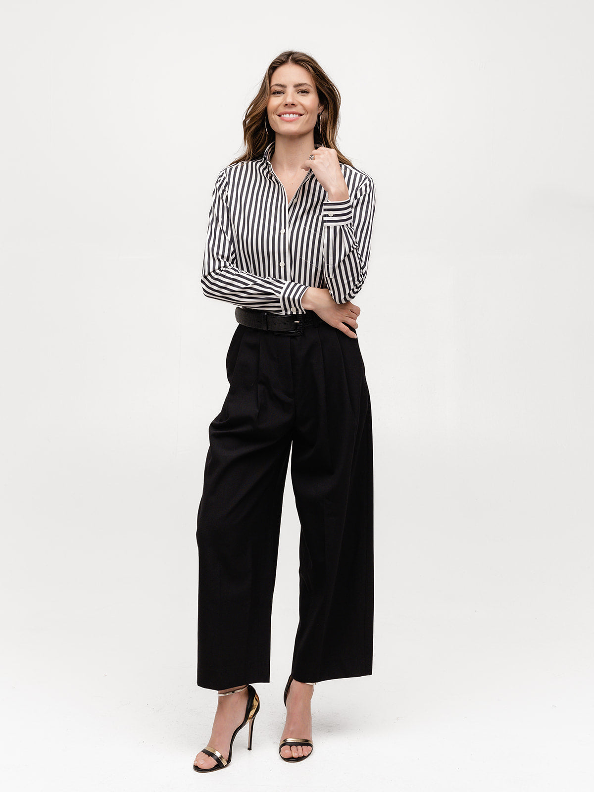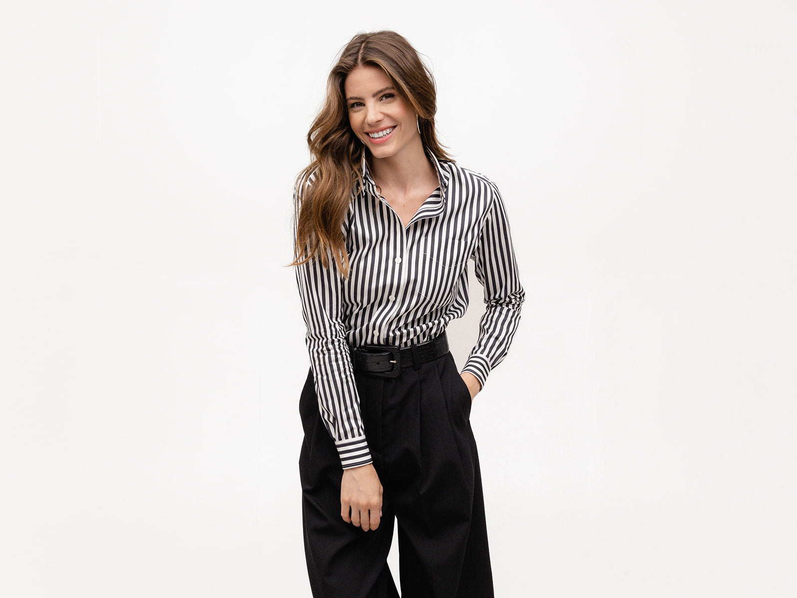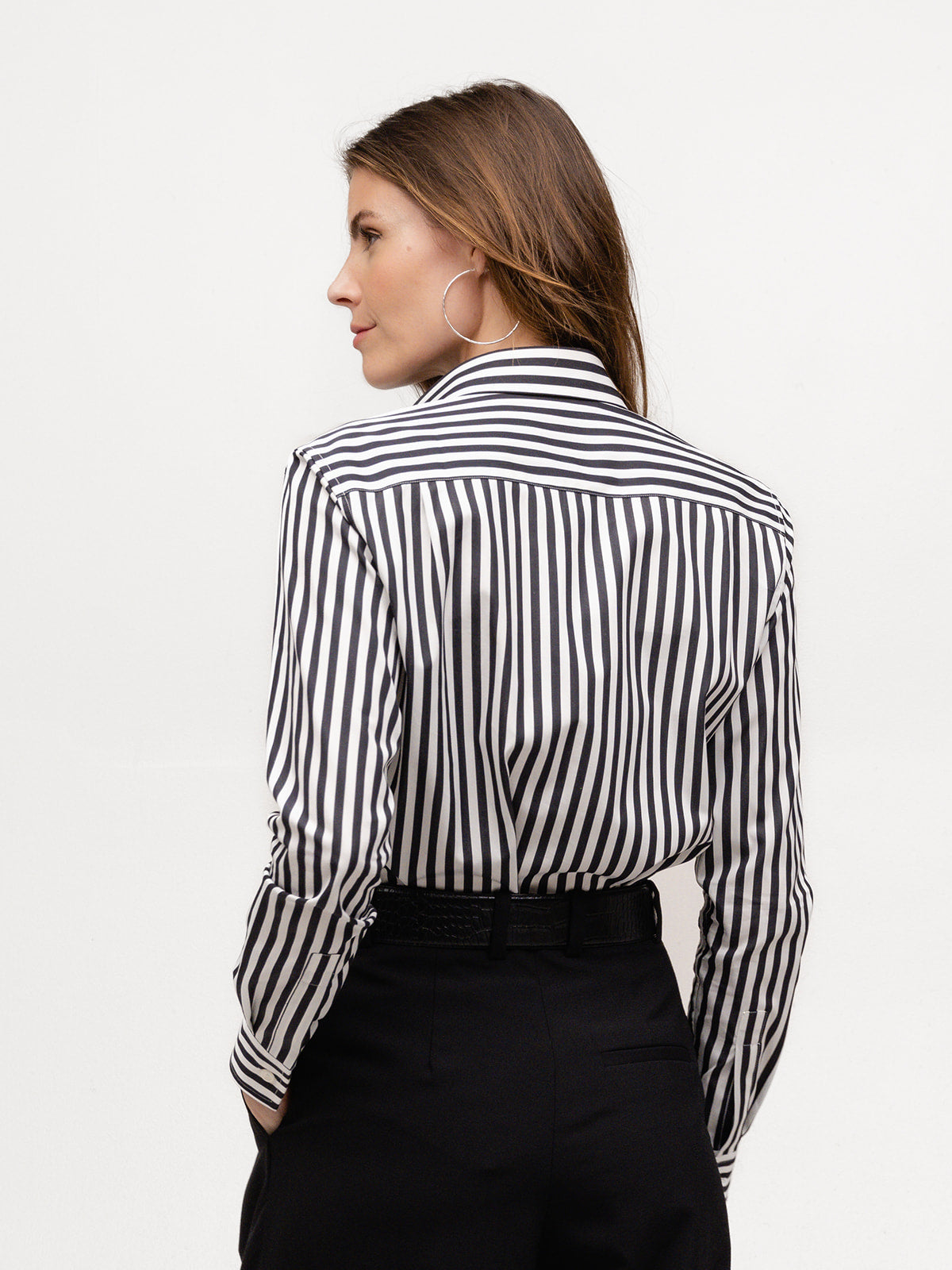 The Weekend Shirt embodies the carefree spirit of Saturdays and Sundays that you will enjoy and wear 7 days a week. Dress it up or down with your favorite jeans, edgy leather pants, or a chic pencil skirt—it’s your go-anywhere, do-anything shirt. Sartorially influenced by menswear, this classic sports a two-piece collar, front pocket, and beveled placket and cuff buttons.