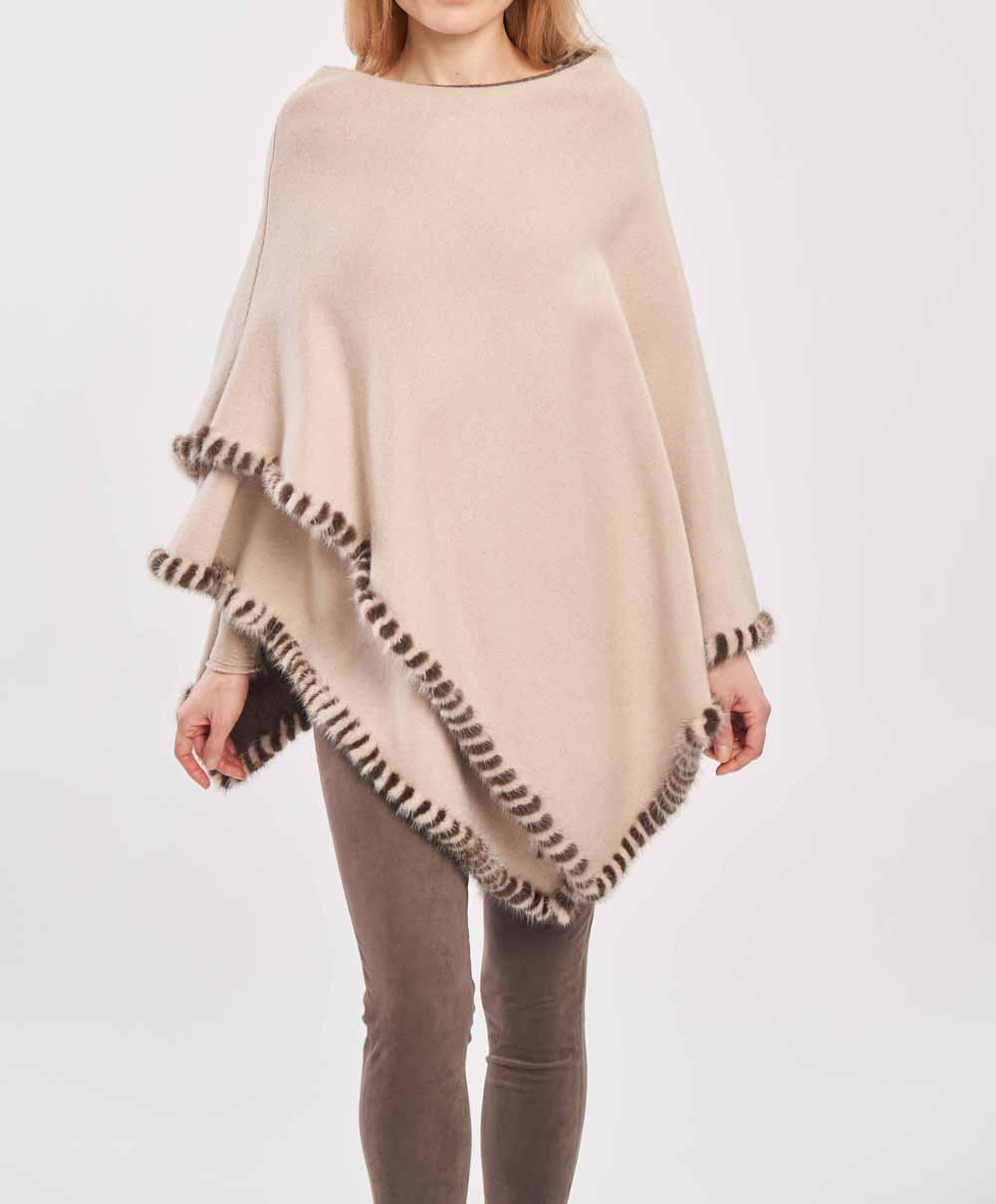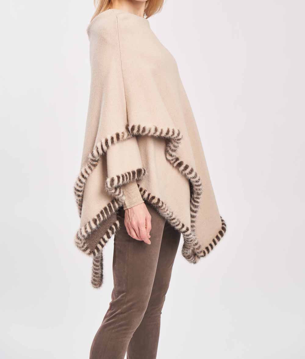 Made from soft wool, the triangular poncho has a cozy drape and mink trim that casually hangs over your arms.