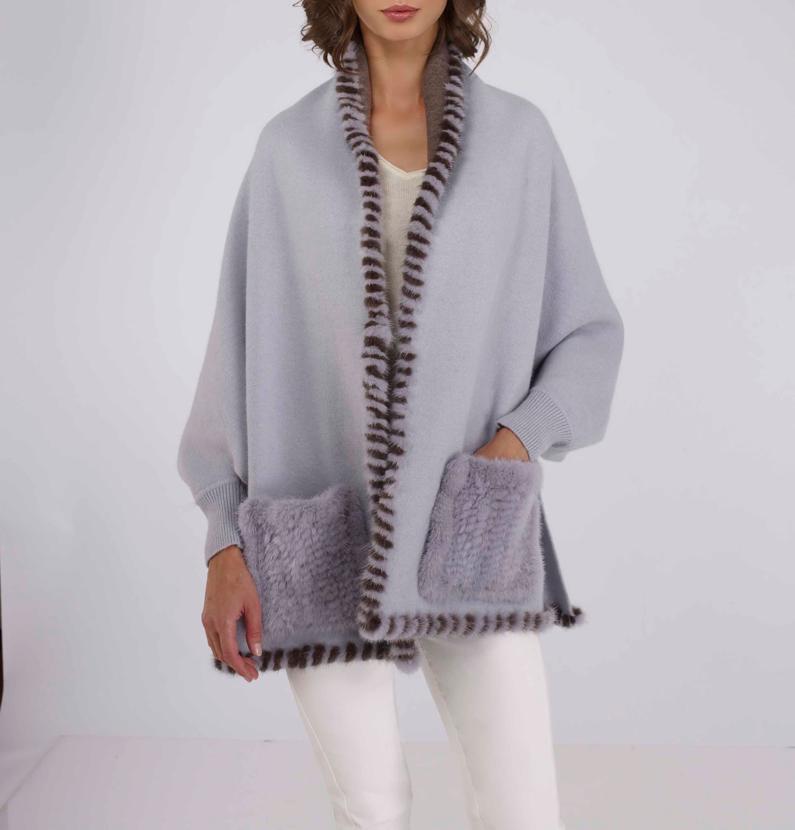 Crafted from soft wool, this triangular wrap with sleeves features a cozy drape, mink trim around the collar, and a mink pocket for added warmth.